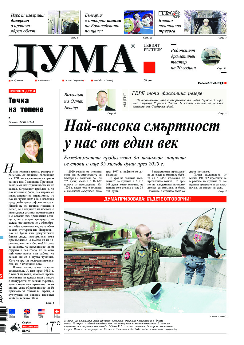 АБОНАМЕНТ за вестник „ДУМА“ за 2026 година. Можете да се абонирате в: „Български пощи“ АД до 15 декември 2025 г., „Доби прес“ ЕООД до 28 декември 2025 г., в редакцията на вестника до 20 декември 2025 г. Каталожен номер 6. Цени: 12 месеца - 149 € / 291,42 лв., 6 месеца - 75 € / 146,69 лв., 3 месеца - 40 € / 78,23 лв., 1 месец - 14 € / 27,38 лв. За повече информация тел. 02 9705 203 и 02 9705 216 отдел „Разпространение” на в-к ДУМА на ул. „Позитано” 20 А. E-mail: abonament@duma.bg АБОНАМЕНТ за вестник „ДУМА“ за 2026 година. Можете да се абонирате в: „Български пощи“ АД до 15 декември 2025 г., „Доби прес“ ЕООД до 28 декември 2025 г., в редакцията на вестника до 20 декември 2025 г. Каталожен номер 6. Цени: 12 месеца - 149 € / 291,42 лв., 6 месеца - 75 € / 146,69 лв., 3 месеца - 40 € / 78,23 лв., 1 месец - 14 € / 27,38 лв. За повече информация тел. 02 9705 203 и 02 9705 216 отдел „Разпространение” на в-к ДУМА на ул. „Позитано” 20 А. E-mail: abonament@duma.bg