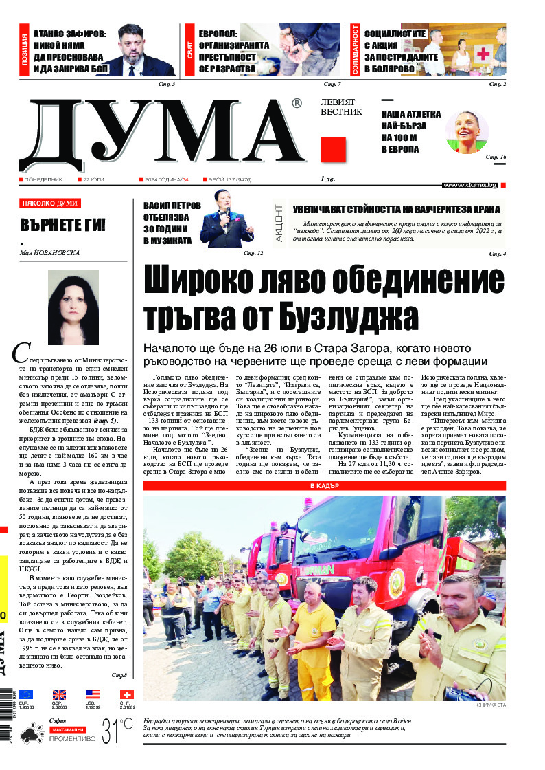 АБОНАМЕНТ за вестник „ДУМА“ за 2026 година. Можете да се абонирате в: „Български пощи“ АД до 15 декември 2025 г., „Доби прес“ ЕООД до 28 декември 2025 г., в редакцията на вестника до 20 декември 2025 г. Каталожен номер 6. Цени: 12 месеца - 149 € / 291,42 лв., 6 месеца - 75 € / 146,69 лв., 3 месеца - 40 € / 78,23 лв., 1 месец - 14 € / 27,38 лв. За повече информация тел. 02 9705 203 и 02 9705 216 отдел „Разпространение” на в-к ДУМА на ул. „Позитано” 20 А. E-mail: abonament@duma.bg АБОНАМЕНТ за вестник „ДУМА“ за 2026 година. Можете да се абонирате в: „Български пощи“ АД до 15 декември 2025 г., „Доби прес“ ЕООД до 28 декември 2025 г., в редакцията на вестника до 20 декември 2025 г. Каталожен номер 6. Цени: 12 месеца - 149 € / 291,42 лв., 6 месеца - 75 € / 146,69 лв., 3 месеца - 40 € / 78,23 лв., 1 месец - 14 € / 27,38 лв. За повече информация тел. 02 9705 203 и 02 9705 216 отдел „Разпространение” на в-к ДУМА на ул. „Позитано” 20 А. E-mail: abonament@duma.bg