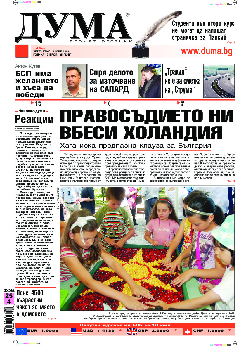 АБОНАМЕНТ за вестник „ДУМА“ за 2026 година. Можете да се абонирате в: „Български пощи“ АД до 15 декември 2025 г., „Доби прес“ ЕООД до 28 декември 2025 г., в редакцията на вестника до 20 декември 2025 г. Каталожен номер 6. Цени: 12 месеца - 149 € / 291,42 лв., 6 месеца - 75 € / 146,69 лв., 3 месеца - 40 € / 78,23 лв., 1 месец - 14 € / 27,38 лв. За повече информация тел. 02 9705 203 и 02 9705 216 отдел „Разпространение” на в-к ДУМА на ул. „Позитано” 20 А. E-mail: abonament@duma.bg АБОНАМЕНТ за вестник „ДУМА“ за 2026 година. Можете да се абонирате в: „Български пощи“ АД до 15 декември 2025 г., „Доби прес“ ЕООД до 28 декември 2025 г., в редакцията на вестника до 20 декември 2025 г. Каталожен номер 6. Цени: 12 месеца - 149 € / 291,42 лв., 6 месеца - 75 € / 146,69 лв., 3 месеца - 40 € / 78,23 лв., 1 месец - 14 € / 27,38 лв. За повече информация тел. 02 9705 203 и 02 9705 216 отдел „Разпространение” на в-к ДУМА на ул. „Позитано” 20 А. E-mail: abonament@duma.bg