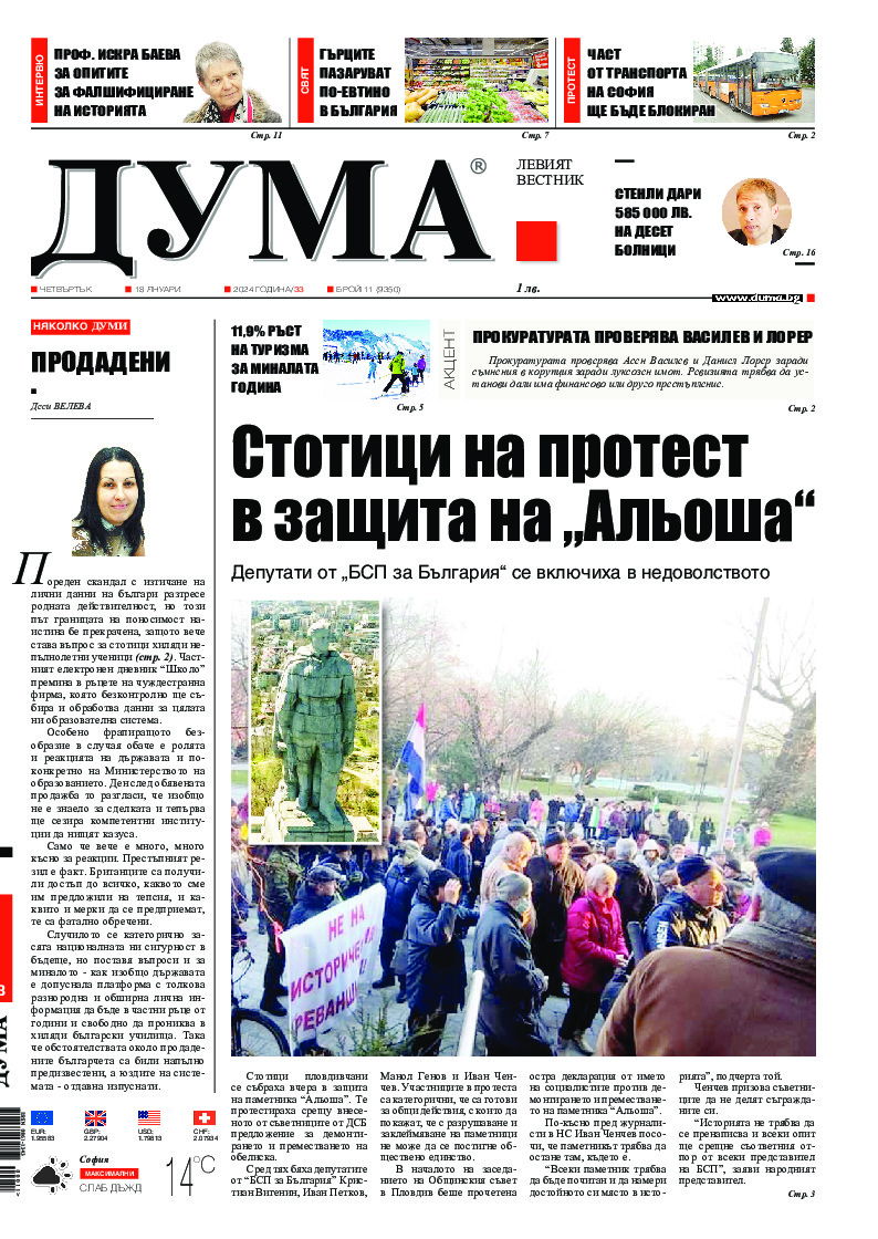 АБОНАМЕНТ за вестник „ДУМА“ за 2026 година. Можете да се абонирате в: „Български пощи“ АД до 15 декември 2025 г., „Доби прес“ ЕООД до 28 декември 2025 г., в редакцията на вестника до 20 декември 2025 г. Каталожен номер 6. Цени: 12 месеца - 149 € / 291,42 лв., 6 месеца - 75 € / 146,69 лв., 3 месеца - 40 € / 78,23 лв., 1 месец - 14 € / 27,38 лв. За повече информация тел. 02 9705 203 и 02 9705 216 отдел „Разпространение” на в-к ДУМА на ул. „Позитано” 20 А. E-mail: abonament@duma.bg АБОНАМЕНТ за вестник „ДУМА“ за 2026 година. Можете да се абонирате в: „Български пощи“ АД до 15 декември 2025 г., „Доби прес“ ЕООД до 28 декември 2025 г., в редакцията на вестника до 20 декември 2025 г. Каталожен номер 6. Цени: 12 месеца - 149 € / 291,42 лв., 6 месеца - 75 € / 146,69 лв., 3 месеца - 40 € / 78,23 лв., 1 месец - 14 € / 27,38 лв. За повече информация тел. 02 9705 203 и 02 9705 216 отдел „Разпространение” на в-к ДУМА на ул. „Позитано” 20 А. E-mail: abonament@duma.bg