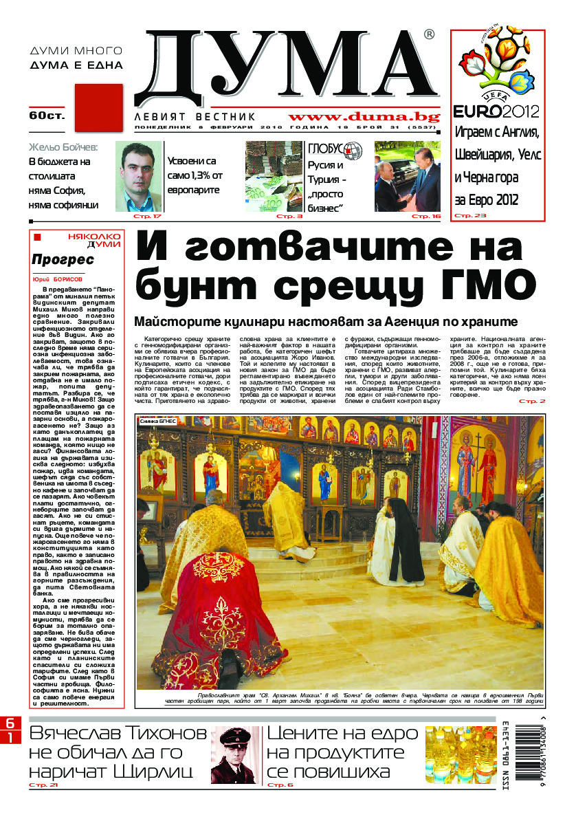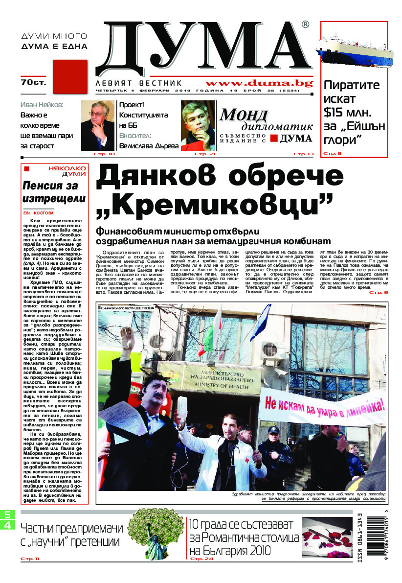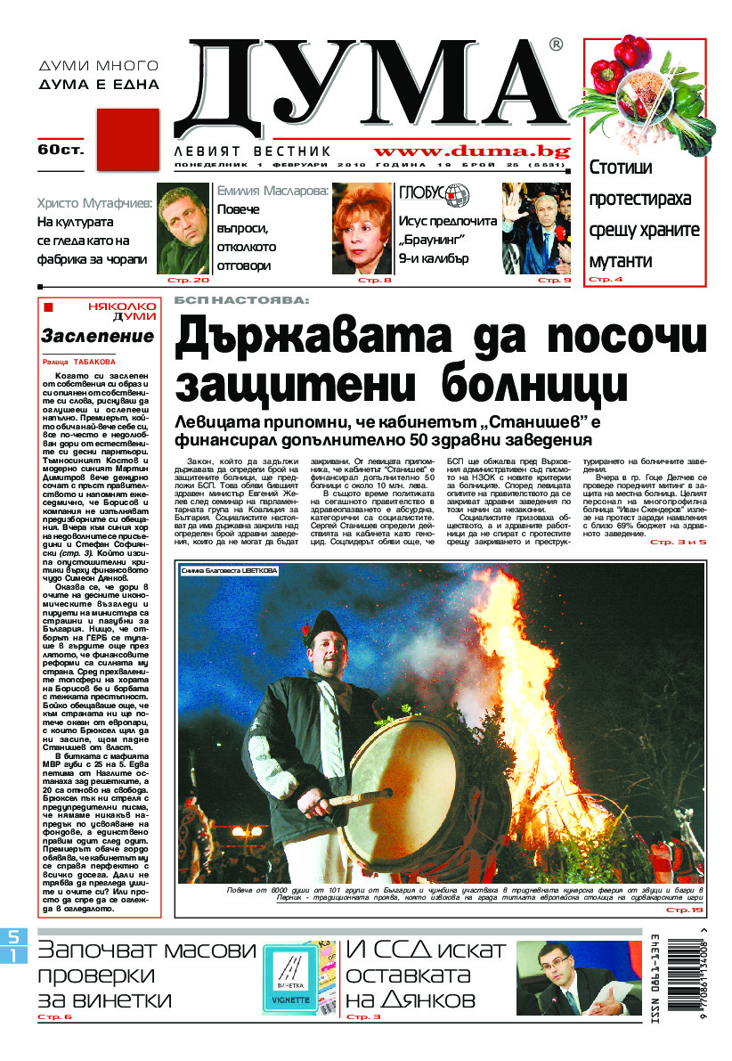 АБОНАМЕНТ за вестник „ДУМА“ за 2026 година. Можете да се абонирате в: „Български пощи“ АД до 15 декември 2025 г., „Доби прес“ ЕООД до 28 декември 2025 г., в редакцията на вестника до 20 декември 2025 г. Каталожен номер 6. Цени: 12 месеца - 149 € / 291,42 лв., 6 месеца - 75 € / 146,69 лв., 3 месеца - 40 € / 78,23 лв., 1 месец - 14 € / 27,38 лв. За повече информация тел. 02 9705 203 и 02 9705 216 отдел „Разпространение” на в-к ДУМА на ул. „Позитано” 20 А. E-mail: abonament@duma.bg АБОНАМЕНТ за вестник „ДУМА“ за 2026 година. Можете да се абонирате в: „Български пощи“ АД до 15 декември 2025 г., „Доби прес“ ЕООД до 28 декември 2025 г., в редакцията на вестника до 20 декември 2025 г. Каталожен номер 6. Цени: 12 месеца - 149 € / 291,42 лв., 6 месеца - 75 € / 146,69 лв., 3 месеца - 40 € / 78,23 лв., 1 месец - 14 € / 27,38 лв. За повече информация тел. 02 9705 203 и 02 9705 216 отдел „Разпространение” на в-к ДУМА на ул. „Позитано” 20 А. E-mail: abonament@duma.bg