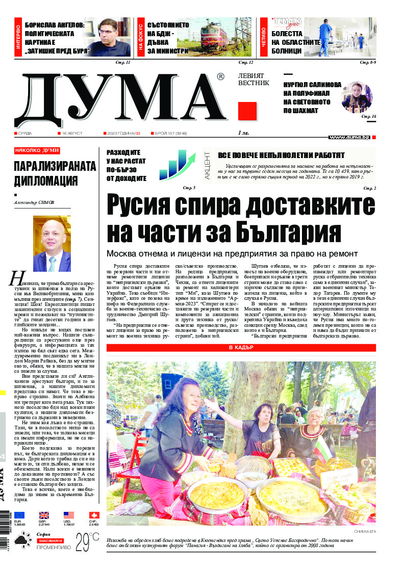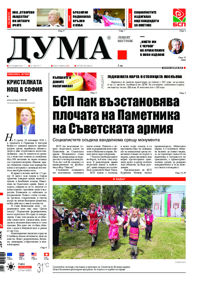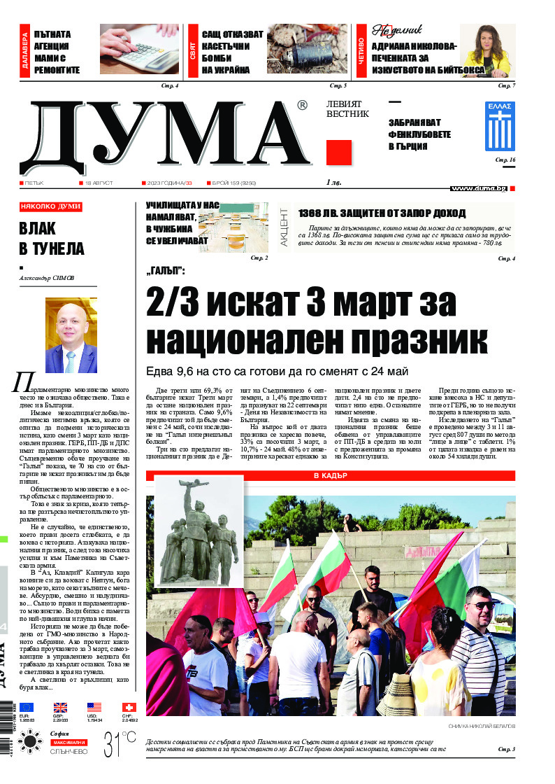 АБОНАМЕНТ за вестник „ДУМА“ за 2026 година. Можете да се абонирате в: „Български пощи“ АД до 15 декември 2025 г., „Доби прес“ ЕООД до 28 декември 2025 г., в редакцията на вестника до 20 декември 2025 г. Каталожен номер 6. Цени: 12 месеца - 149 € / 291,42 лв., 6 месеца - 75 € / 146,69 лв., 3 месеца - 40 € / 78,23 лв., 1 месец - 14 € / 27,38 лв. За повече информация тел. 02 9705 203 и 02 9705 216 отдел „Разпространение” на в-к ДУМА на ул. „Позитано” 20 А. E-mail: abonament@duma.bg АБОНАМЕНТ за вестник „ДУМА“ за 2026 година. Можете да се абонирате в: „Български пощи“ АД до 15 декември 2025 г., „Доби прес“ ЕООД до 28 декември 2025 г., в редакцията на вестника до 20 декември 2025 г. Каталожен номер 6. Цени: 12 месеца - 149 € / 291,42 лв., 6 месеца - 75 € / 146,69 лв., 3 месеца - 40 € / 78,23 лв., 1 месец - 14 € / 27,38 лв. За повече информация тел. 02 9705 203 и 02 9705 216 отдел „Разпространение” на в-к ДУМА на ул. „Позитано” 20 А. E-mail: abonament@duma.bg
