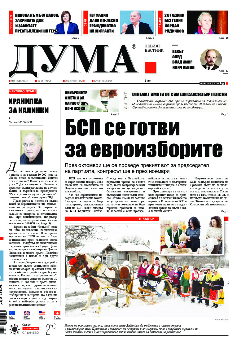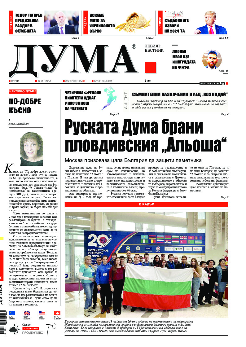 АБОНАМЕНТ за вестник „ДУМА“ за 2026 година. Можете да се абонирате в: „Български пощи“ АД до 15 декември 2025 г., „Доби прес“ ЕООД до 28 декември 2025 г., в редакцията на вестника до 20 декември 2025 г. Каталожен номер 6. Цени: 12 месеца - 149 € / 291,42 лв., 6 месеца - 75 € / 146,69 лв., 3 месеца - 40 € / 78,23 лв., 1 месец - 14 € / 27,38 лв. За повече информация тел. 02 9705 203 и 02 9705 216 отдел „Разпространение” на в-к ДУМА на ул. „Позитано” 20 А. E-mail: abonament@duma.bg АБОНАМЕНТ за вестник „ДУМА“ за 2026 година. Можете да се абонирате в: „Български пощи“ АД до 15 декември 2025 г., „Доби прес“ ЕООД до 28 декември 2025 г., в редакцията на вестника до 20 декември 2025 г. Каталожен номер 6. Цени: 12 месеца - 149 € / 291,42 лв., 6 месеца - 75 € / 146,69 лв., 3 месеца - 40 € / 78,23 лв., 1 месец - 14 € / 27,38 лв. За повече информация тел. 02 9705 203 и 02 9705 216 отдел „Разпространение” на в-к ДУМА на ул. „Позитано” 20 А. E-mail: abonament@duma.bg