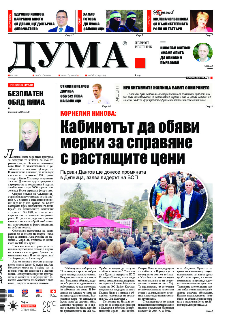 АБОНАМЕНТ за вестник „ДУМА“ за 2026 година. Можете да се абонирате в: „Български пощи“ АД до 15 декември 2025 г., „Доби прес“ ЕООД до 28 декември 2025 г., в редакцията на вестника до 20 декември 2025 г. Каталожен номер 6. Цени: 12 месеца - 149 € / 291,42 лв., 6 месеца - 75 € / 146,69 лв., 3 месеца - 40 € / 78,23 лв., 1 месец - 14 € / 27,38 лв. За повече информация тел. 02 9705 203 и 02 9705 216 отдел „Разпространение” на в-к ДУМА на ул. „Позитано” 20 А. E-mail: abonament@duma.bg АБОНАМЕНТ за вестник „ДУМА“ за 2026 година. Можете да се абонирате в: „Български пощи“ АД до 15 декември 2025 г., „Доби прес“ ЕООД до 28 декември 2025 г., в редакцията на вестника до 20 декември 2025 г. Каталожен номер 6. Цени: 12 месеца - 149 € / 291,42 лв., 6 месеца - 75 € / 146,69 лв., 3 месеца - 40 € / 78,23 лв., 1 месец - 14 € / 27,38 лв. За повече информация тел. 02 9705 203 и 02 9705 216 отдел „Разпространение” на в-к ДУМА на ул. „Позитано” 20 А. E-mail: abonament@duma.bg