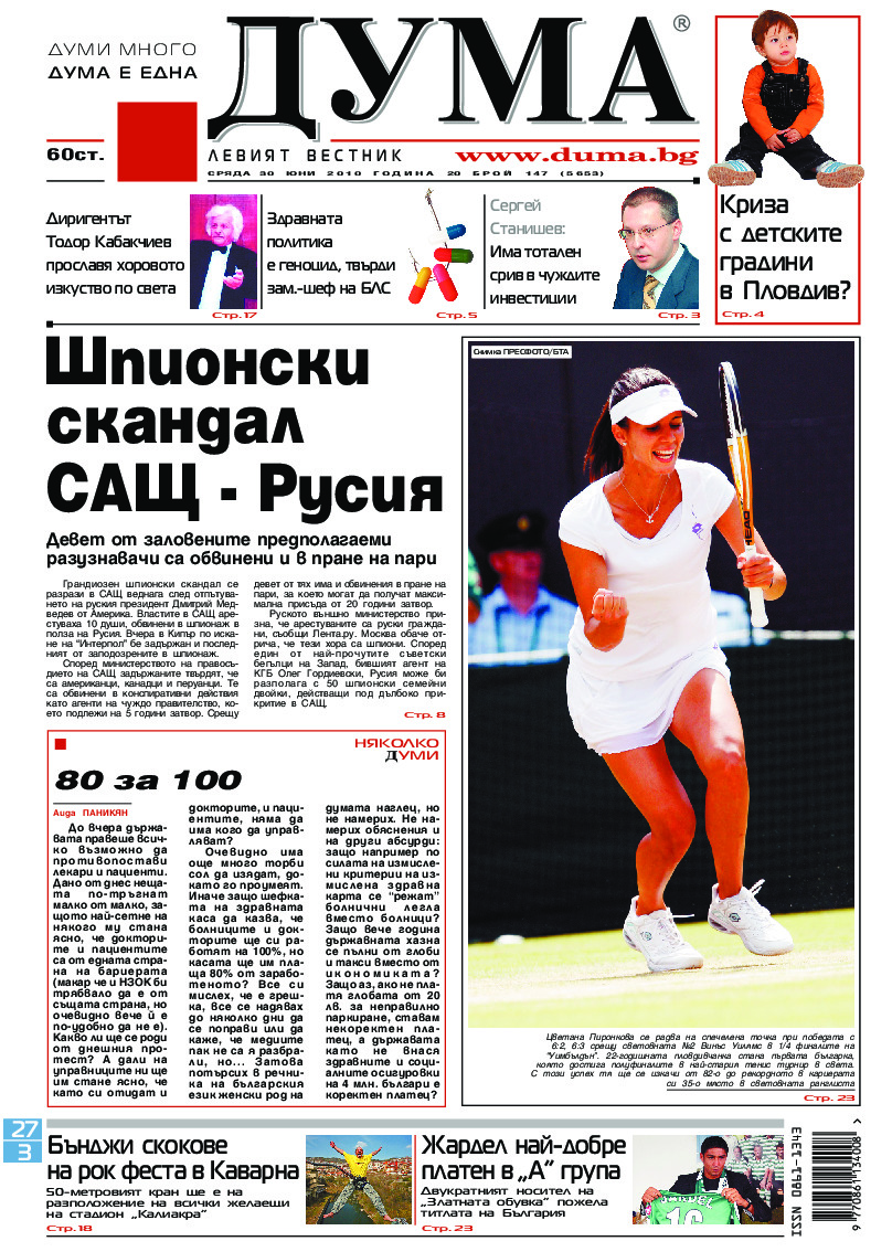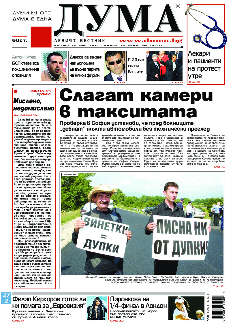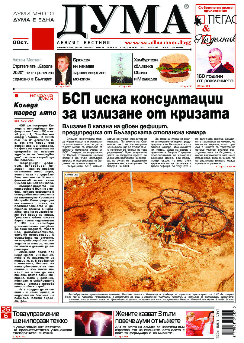 АБОНАМЕНТ за вестник „ДУМА“ за 2026 година. Можете да се абонирате в: „Български пощи“ АД до 15 декември 2025 г., „Доби прес“ ЕООД до 28 декември 2025 г., в редакцията на вестника до 20 декември 2025 г. Каталожен номер 6. Цени: 12 месеца - 149 € / 291,42 лв., 6 месеца - 75 € / 146,69 лв., 3 месеца - 40 € / 78,23 лв., 1 месец - 14 € / 27,38 лв. За повече информация тел. 02 9705 203 и 02 9705 216 отдел „Разпространение” на в-к ДУМА на ул. „Позитано” 20 А. E-mail: abonament@duma.bg АБОНАМЕНТ за вестник „ДУМА“ за 2026 година. Можете да се абонирате в: „Български пощи“ АД до 15 декември 2025 г., „Доби прес“ ЕООД до 28 декември 2025 г., в редакцията на вестника до 20 декември 2025 г. Каталожен номер 6. Цени: 12 месеца - 149 € / 291,42 лв., 6 месеца - 75 € / 146,69 лв., 3 месеца - 40 € / 78,23 лв., 1 месец - 14 € / 27,38 лв. За повече информация тел. 02 9705 203 и 02 9705 216 отдел „Разпространение” на в-к ДУМА на ул. „Позитано” 20 А. E-mail: abonament@duma.bg