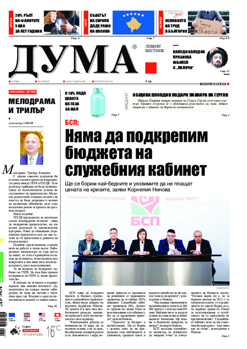 АБОНАМЕНТ за вестник „ДУМА“ за 2026 година. Можете да се абонирате в: „Български пощи“ АД до 15 декември 2025 г., „Доби прес“ ЕООД до 28 декември 2025 г., в редакцията на вестника до 20 декември 2025 г. Каталожен номер 6. Цени: 12 месеца - 149 € / 291,42 лв., 6 месеца - 75 € / 146,69 лв., 3 месеца - 40 € / 78,23 лв., 1 месец - 14 € / 27,38 лв. За повече информация тел. 02 9705 203 и 02 9705 216 отдел „Разпространение” на в-к ДУМА на ул. „Позитано” 20 А. E-mail: abonament@duma.bg АБОНАМЕНТ за вестник „ДУМА“ за 2026 година. Можете да се абонирате в: „Български пощи“ АД до 15 декември 2025 г., „Доби прес“ ЕООД до 28 декември 2025 г., в редакцията на вестника до 20 декември 2025 г. Каталожен номер 6. Цени: 12 месеца - 149 € / 291,42 лв., 6 месеца - 75 € / 146,69 лв., 3 месеца - 40 € / 78,23 лв., 1 месец - 14 € / 27,38 лв. За повече информация тел. 02 9705 203 и 02 9705 216 отдел „Разпространение” на в-к ДУМА на ул. „Позитано” 20 А. E-mail: abonament@duma.bg