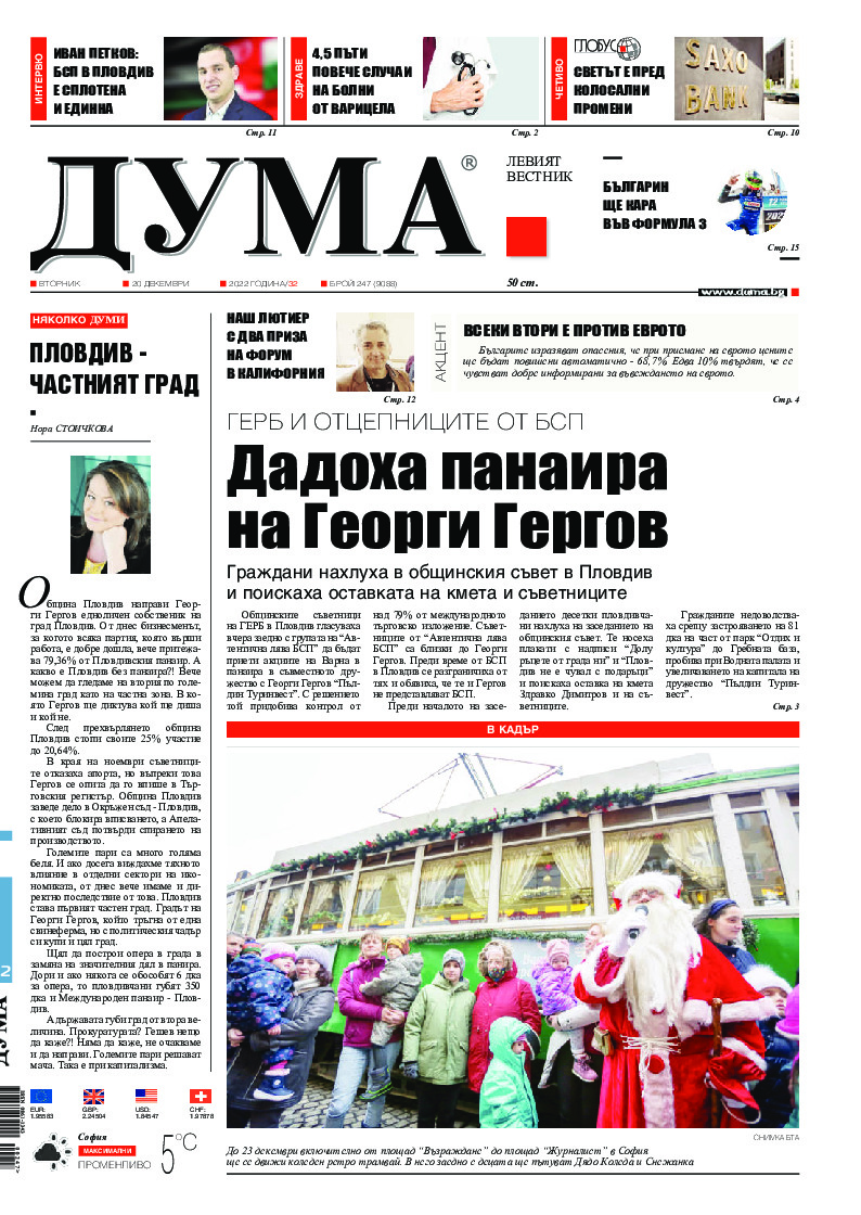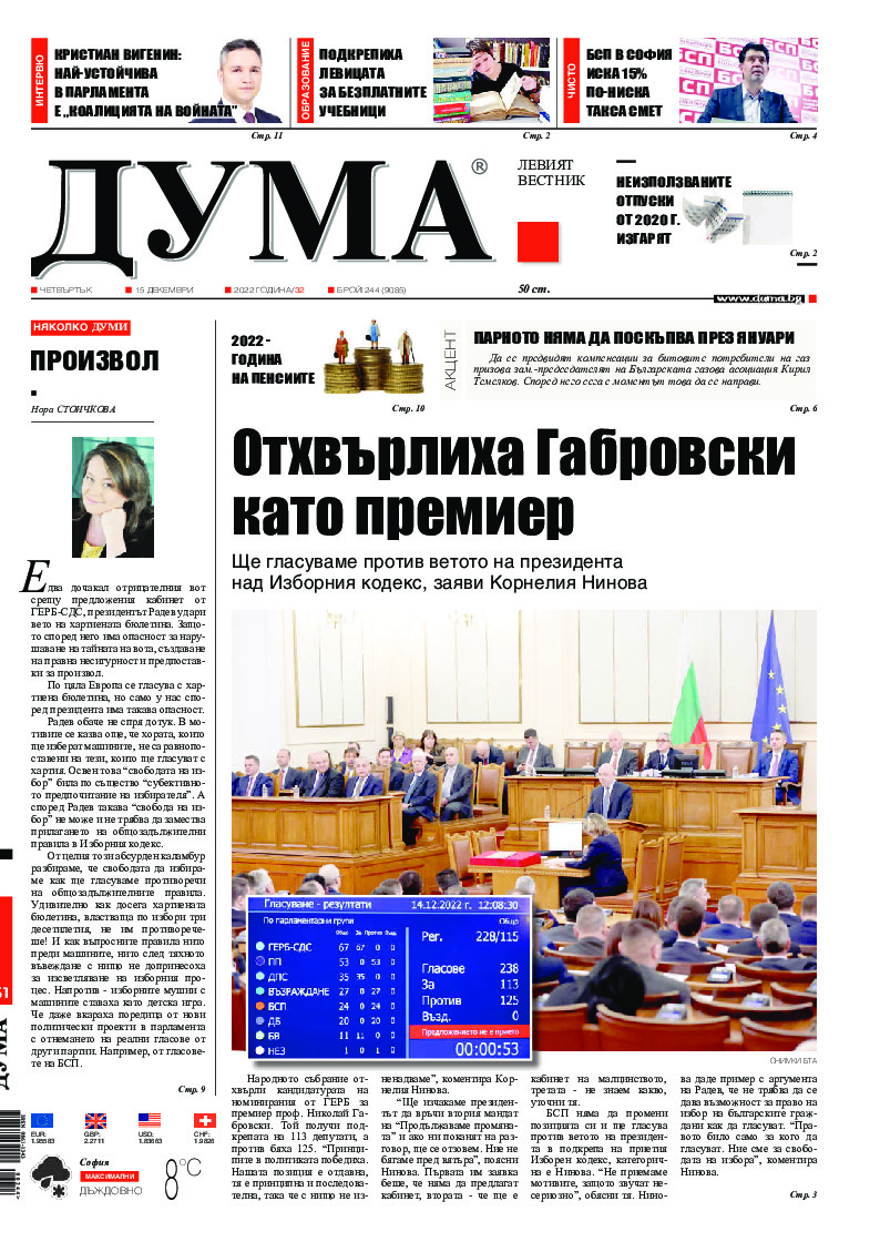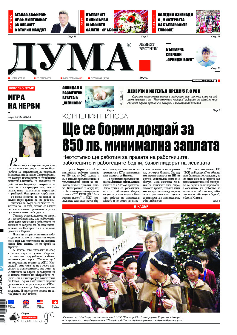 АБОНАМЕНТ за вестник „ДУМА“ за 2026 година. Можете да се абонирате в: „Български пощи“ АД до 15 декември 2025 г., „Доби прес“ ЕООД до 28 декември 2025 г., в редакцията на вестника до 20 декември 2025 г. Каталожен номер 6. Цени: 12 месеца - 149 € / 291,42 лв., 6 месеца - 75 € / 146,69 лв., 3 месеца - 40 € / 78,23 лв., 1 месец - 14 € / 27,38 лв. За повече информация тел. 02 9705 203 и 02 9705 216 отдел „Разпространение” на в-к ДУМА на ул. „Позитано” 20 А. E-mail: abonament@duma.bg АБОНАМЕНТ за вестник „ДУМА“ за 2026 година. Можете да се абонирате в: „Български пощи“ АД до 15 декември 2025 г., „Доби прес“ ЕООД до 28 декември 2025 г., в редакцията на вестника до 20 декември 2025 г. Каталожен номер 6. Цени: 12 месеца - 149 € / 291,42 лв., 6 месеца - 75 € / 146,69 лв., 3 месеца - 40 € / 78,23 лв., 1 месец - 14 € / 27,38 лв. За повече информация тел. 02 9705 203 и 02 9705 216 отдел „Разпространение” на в-к ДУМА на ул. „Позитано” 20 А. E-mail: abonament@duma.bg
