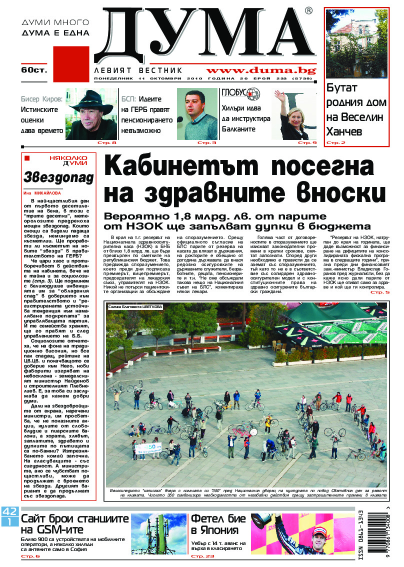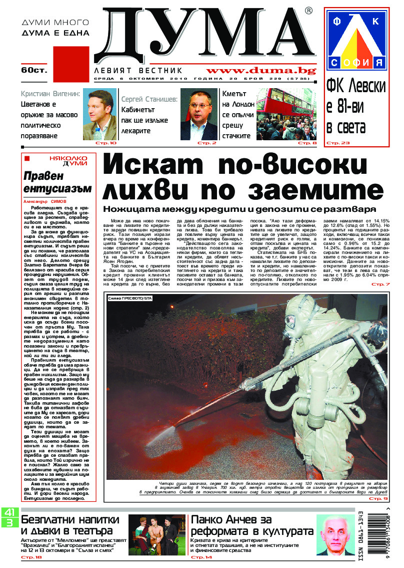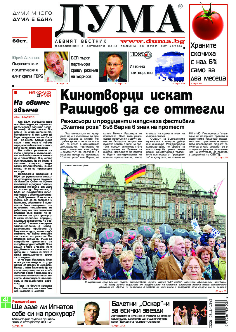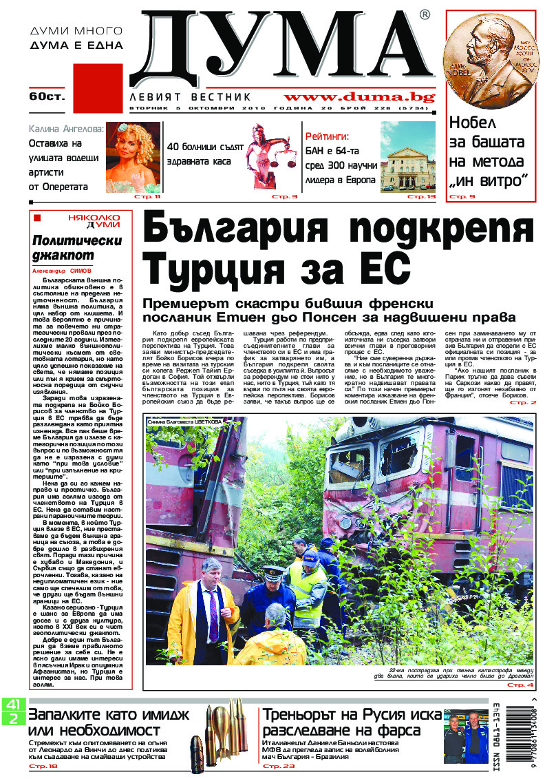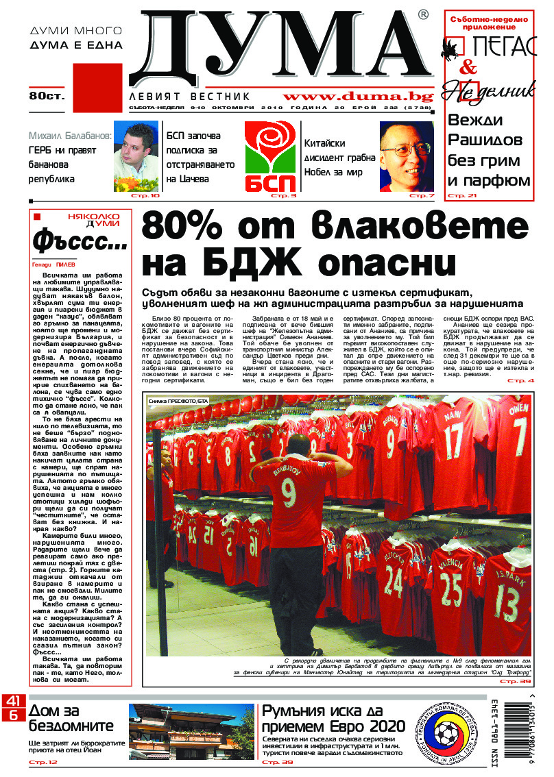 АБОНАМЕНТ за вестник „ДУМА“ за 2026 година. Можете да се абонирате в: „Български пощи“ АД до 15 декември 2025 г., „Доби прес“ ЕООД до 28 декември 2025 г., в редакцията на вестника до 20 декември 2025 г. Каталожен номер 6. Цени: 12 месеца - 149 € / 291,42 лв., 6 месеца - 75 € / 146,69 лв., 3 месеца - 40 € / 78,23 лв., 1 месец - 14 € / 27,38 лв. За повече информация тел. 02 9705 203 и 02 9705 216 отдел „Разпространение” на в-к ДУМА на ул. „Позитано” 20 А. E-mail: abonament@duma.bg АБОНАМЕНТ за вестник „ДУМА“ за 2026 година. Можете да се абонирате в: „Български пощи“ АД до 15 декември 2025 г., „Доби прес“ ЕООД до 28 декември 2025 г., в редакцията на вестника до 20 декември 2025 г. Каталожен номер 6. Цени: 12 месеца - 149 € / 291,42 лв., 6 месеца - 75 € / 146,69 лв., 3 месеца - 40 € / 78,23 лв., 1 месец - 14 € / 27,38 лв. За повече информация тел. 02 9705 203 и 02 9705 216 отдел „Разпространение” на в-к ДУМА на ул. „Позитано” 20 А. E-mail: abonament@duma.bg