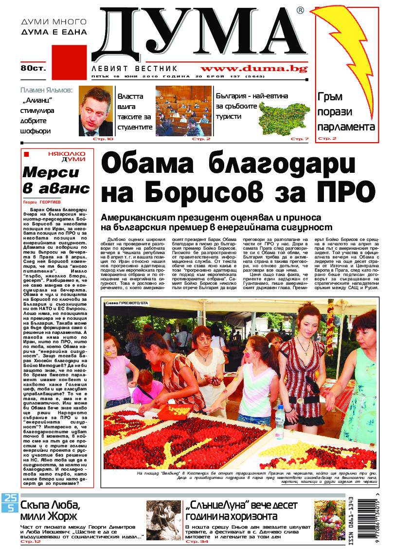 АБОНАМЕНТ за вестник „ДУМА“ за 2026 година. Можете да се абонирате в: „Български пощи“ АД до 15 декември 2025 г., „Доби прес“ ЕООД до 28 декември 2025 г., в редакцията на вестника до 20 декември 2025 г. Каталожен номер 6. Цени: 12 месеца - 149 € / 291,42 лв., 6 месеца - 75 € / 146,69 лв., 3 месеца - 40 € / 78,23 лв., 1 месец - 14 € / 27,38 лв. За повече информация тел. 02 9705 203 и 02 9705 216 отдел „Разпространение” на в-к ДУМА на ул. „Позитано” 20 А. E-mail: abonament@duma.bg АБОНАМЕНТ за вестник „ДУМА“ за 2026 година. Можете да се абонирате в: „Български пощи“ АД до 15 декември 2025 г., „Доби прес“ ЕООД до 28 декември 2025 г., в редакцията на вестника до 20 декември 2025 г. Каталожен номер 6. Цени: 12 месеца - 149 € / 291,42 лв., 6 месеца - 75 € / 146,69 лв., 3 месеца - 40 € / 78,23 лв., 1 месец - 14 € / 27,38 лв. За повече информация тел. 02 9705 203 и 02 9705 216 отдел „Разпространение” на в-к ДУМА на ул. „Позитано” 20 А. E-mail: abonament@duma.bg