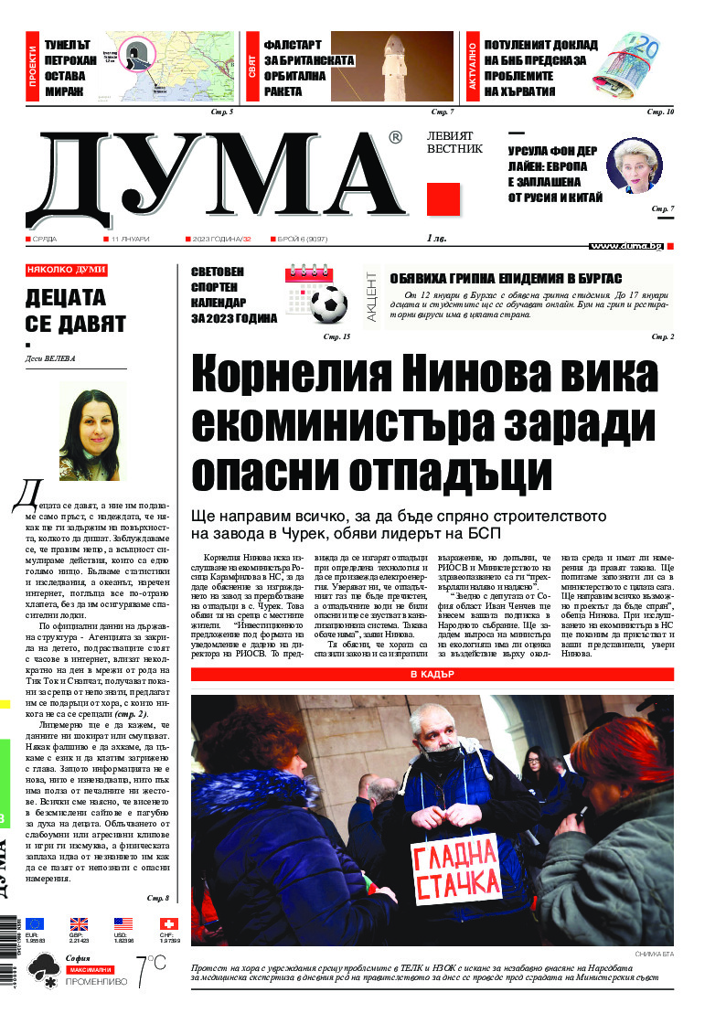 АБОНАМЕНТ за вестник „ДУМА“ за 2026 година. Можете да се абонирате в: „Български пощи“ АД до 15 декември 2025 г., „Доби прес“ ЕООД до 28 декември 2025 г., в редакцията на вестника до 20 декември 2025 г. Каталожен номер 6. Цени: 12 месеца - 149 € / 291,42 лв., 6 месеца - 75 € / 146,69 лв., 3 месеца - 40 € / 78,23 лв., 1 месец - 14 € / 27,38 лв. За повече информация тел. 02 9705 203 и 02 9705 216 отдел „Разпространение” на в-к ДУМА на ул. „Позитано” 20 А. E-mail: abonament@duma.bg АБОНАМЕНТ за вестник „ДУМА“ за 2026 година. Можете да се абонирате в: „Български пощи“ АД до 15 декември 2025 г., „Доби прес“ ЕООД до 28 декември 2025 г., в редакцията на вестника до 20 декември 2025 г. Каталожен номер 6. Цени: 12 месеца - 149 € / 291,42 лв., 6 месеца - 75 € / 146,69 лв., 3 месеца - 40 € / 78,23 лв., 1 месец - 14 € / 27,38 лв. За повече информация тел. 02 9705 203 и 02 9705 216 отдел „Разпространение” на в-к ДУМА на ул. „Позитано” 20 А. E-mail: abonament@duma.bg