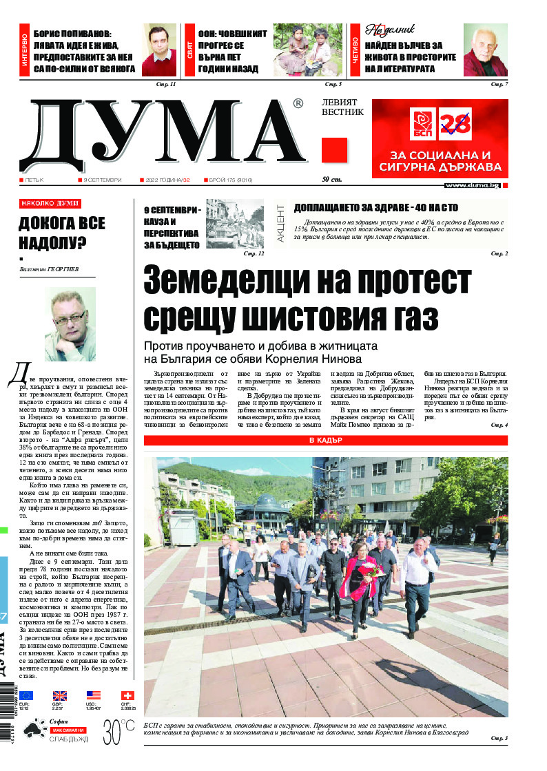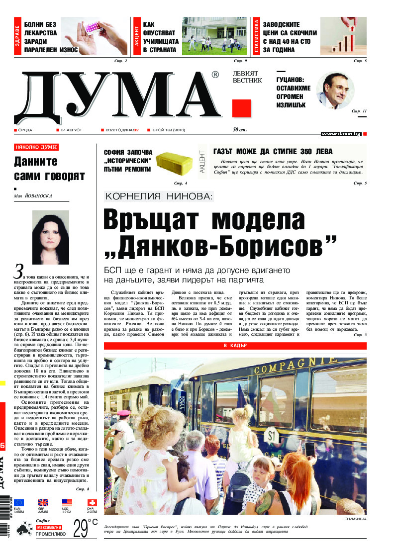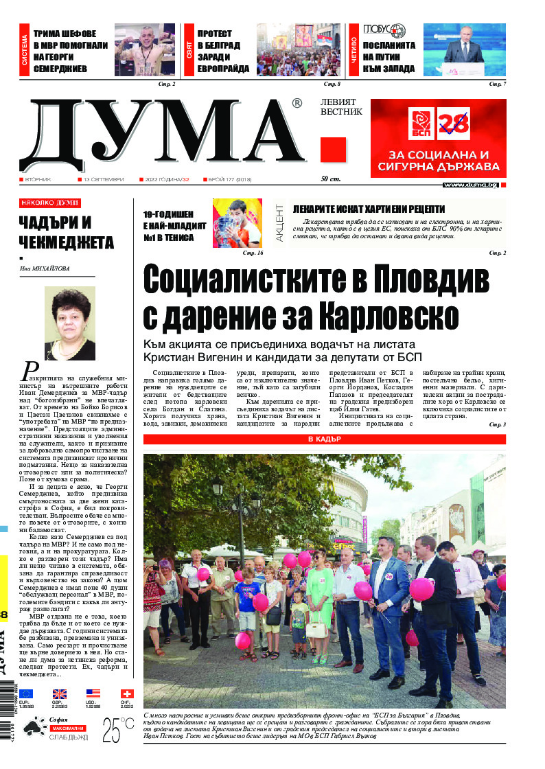 АБОНАМЕНТ за вестник „ДУМА“ за 2026 година. Можете да се абонирате в: „Български пощи“ АД до 15 декември 2025 г., „Доби прес“ ЕООД до 28 декември 2025 г., в редакцията на вестника до 20 декември 2025 г. Каталожен номер 6. Цени: 12 месеца - 149 € / 291,42 лв., 6 месеца - 75 € / 146,69 лв., 3 месеца - 40 € / 78,23 лв., 1 месец - 14 € / 27,38 лв. За повече информация тел. 02 9705 203 и 02 9705 216 отдел „Разпространение” на в-к ДУМА на ул. „Позитано” 20 А. E-mail: abonament@duma.bg АБОНАМЕНТ за вестник „ДУМА“ за 2026 година. Можете да се абонирате в: „Български пощи“ АД до 15 декември 2025 г., „Доби прес“ ЕООД до 28 декември 2025 г., в редакцията на вестника до 20 декември 2025 г. Каталожен номер 6. Цени: 12 месеца - 149 € / 291,42 лв., 6 месеца - 75 € / 146,69 лв., 3 месеца - 40 € / 78,23 лв., 1 месец - 14 € / 27,38 лв. За повече информация тел. 02 9705 203 и 02 9705 216 отдел „Разпространение” на в-к ДУМА на ул. „Позитано” 20 А. E-mail: abonament@duma.bg