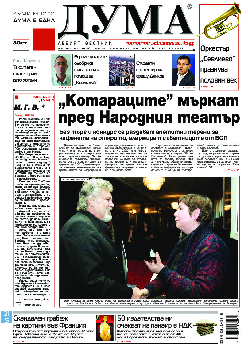АБОНАМЕНТ за вестник „ДУМА“ за 2026 година. Можете да се абонирате в: „Български пощи“ АД до 15 декември 2025 г., „Доби прес“ ЕООД до 28 декември 2025 г., в редакцията на вестника до 20 декември 2025 г. Каталожен номер 6. Цени: 12 месеца - 149 € / 291,42 лв., 6 месеца - 75 € / 146,69 лв., 3 месеца - 40 € / 78,23 лв., 1 месец - 14 € / 27,38 лв. За повече информация тел. 02 9705 203 и 02 9705 216 отдел „Разпространение” на в-к ДУМА на ул. „Позитано” 20 А. E-mail: abonament@duma.bg АБОНАМЕНТ за вестник „ДУМА“ за 2026 година. Можете да се абонирате в: „Български пощи“ АД до 15 декември 2025 г., „Доби прес“ ЕООД до 28 декември 2025 г., в редакцията на вестника до 20 декември 2025 г. Каталожен номер 6. Цени: 12 месеца - 149 € / 291,42 лв., 6 месеца - 75 € / 146,69 лв., 3 месеца - 40 € / 78,23 лв., 1 месец - 14 € / 27,38 лв. За повече информация тел. 02 9705 203 и 02 9705 216 отдел „Разпространение” на в-к ДУМА на ул. „Позитано” 20 А. E-mail: abonament@duma.bg