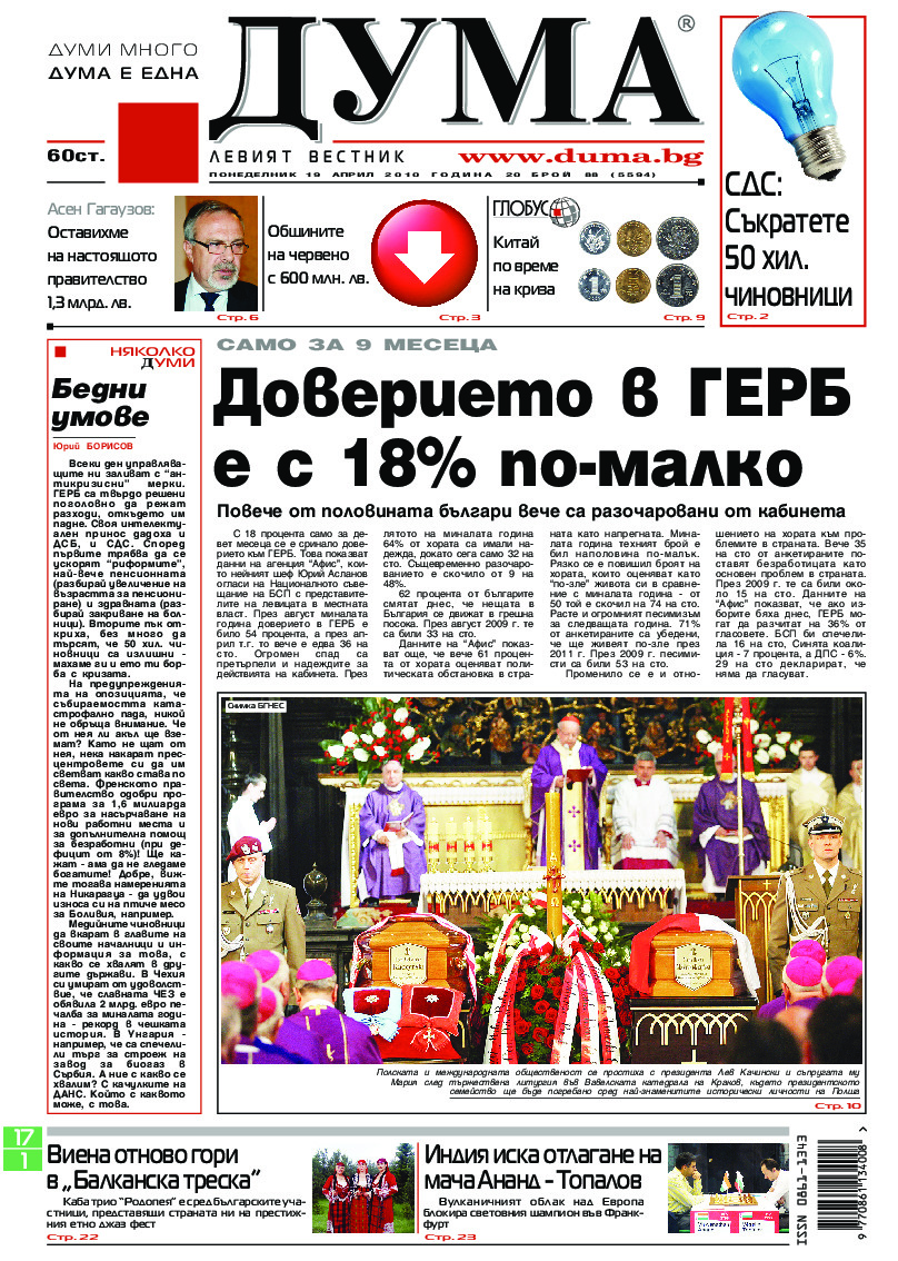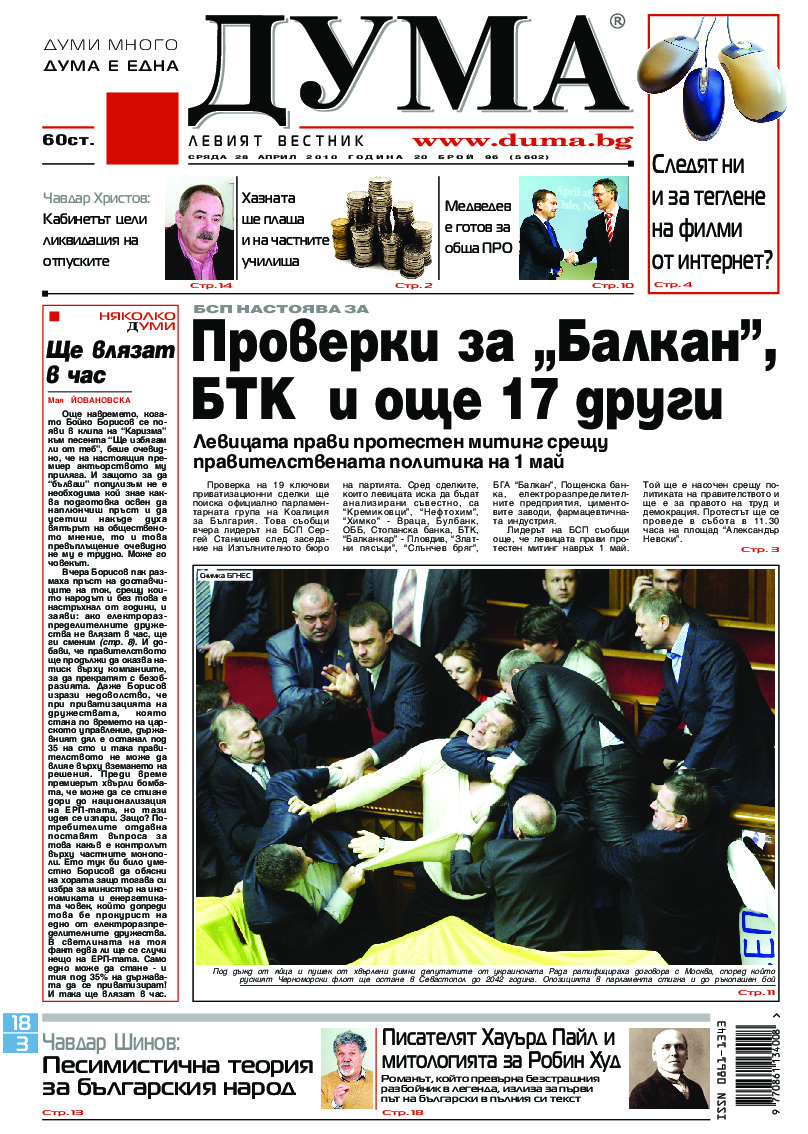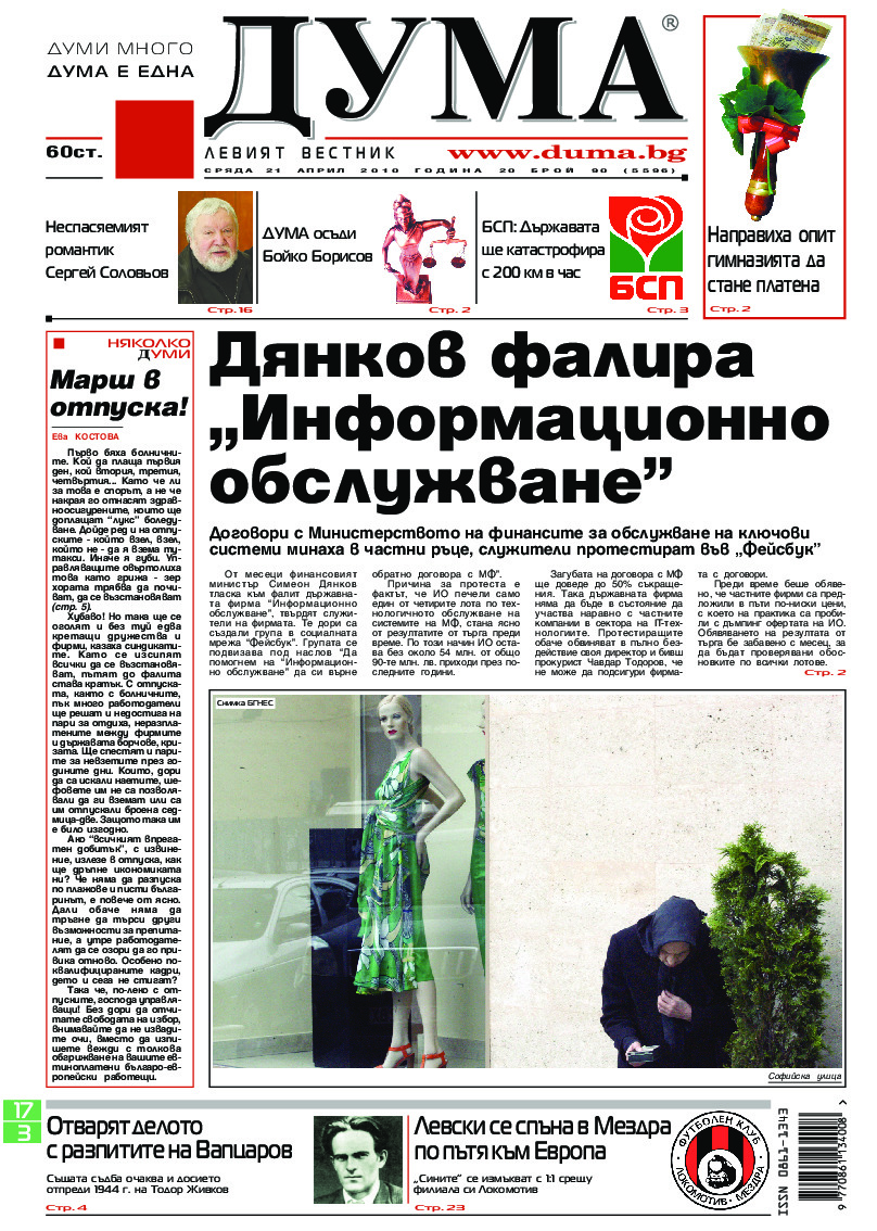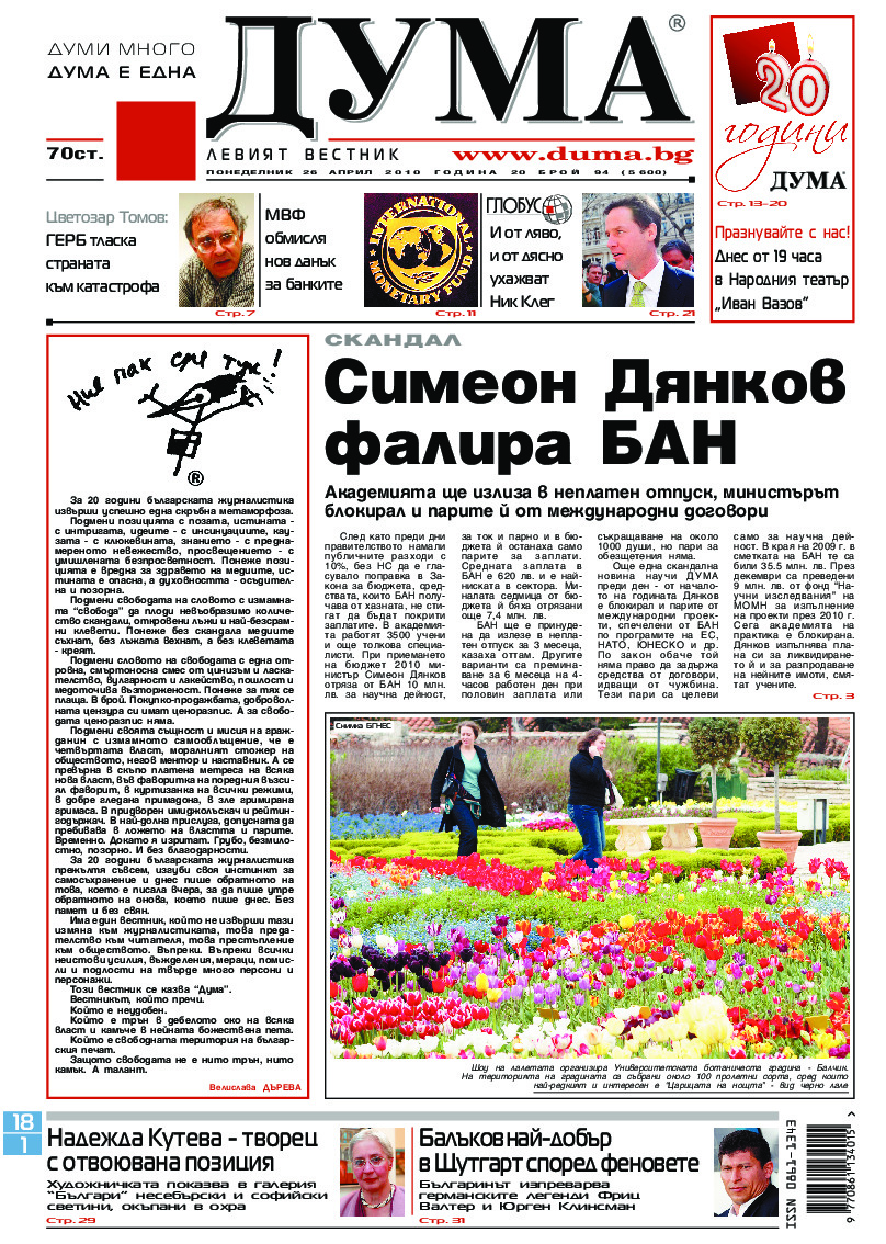 АБОНАМЕНТ за вестник „ДУМА“ за 2026 година. Можете да се абонирате в: „Български пощи“ АД до 15 декември 2025 г., „Доби прес“ ЕООД до 28 декември 2025 г., в редакцията на вестника до 20 декември 2025 г. Каталожен номер 6. Цени: 12 месеца - 149 € / 291,42 лв., 6 месеца - 75 € / 146,69 лв., 3 месеца - 40 € / 78,23 лв., 1 месец - 14 € / 27,38 лв. За повече информация тел. 02 9705 203 и 02 9705 216 отдел „Разпространение” на в-к ДУМА на ул. „Позитано” 20 А. E-mail: abonament@duma.bg АБОНАМЕНТ за вестник „ДУМА“ за 2026 година. Можете да се абонирате в: „Български пощи“ АД до 15 декември 2025 г., „Доби прес“ ЕООД до 28 декември 2025 г., в редакцията на вестника до 20 декември 2025 г. Каталожен номер 6. Цени: 12 месеца - 149 € / 291,42 лв., 6 месеца - 75 € / 146,69 лв., 3 месеца - 40 € / 78,23 лв., 1 месец - 14 € / 27,38 лв. За повече информация тел. 02 9705 203 и 02 9705 216 отдел „Разпространение” на в-к ДУМА на ул. „Позитано” 20 А. E-mail: abonament@duma.bg
