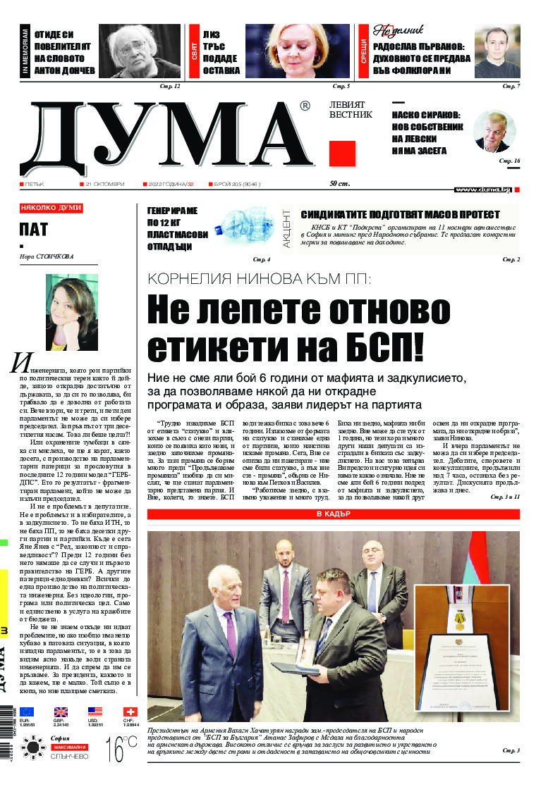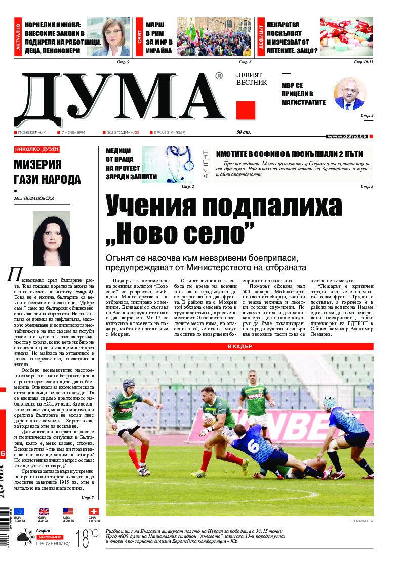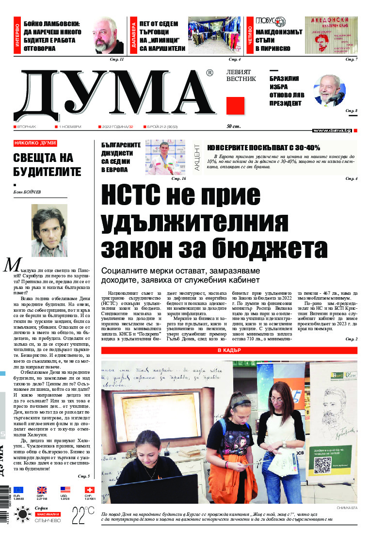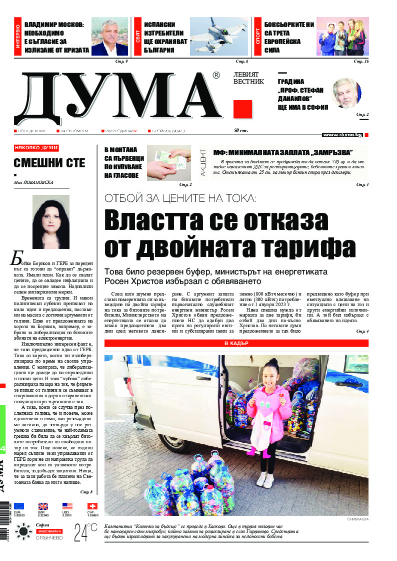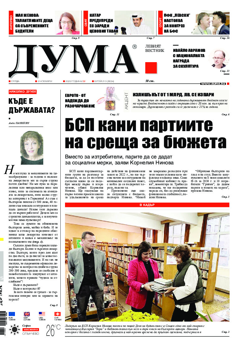 АБОНАМЕНТ за вестник „ДУМА“ за 2026 година. Можете да се абонирате в: „Български пощи“ АД до 15 декември 2025 г., „Доби прес“ ЕООД до 28 декември 2025 г., в редакцията на вестника до 20 декември 2025 г. Каталожен номер 6. Цени: 12 месеца - 149 € / 291,42 лв., 6 месеца - 75 € / 146,69 лв., 3 месеца - 40 € / 78,23 лв., 1 месец - 14 € / 27,38 лв. За повече информация тел. 02 9705 203 и 02 9705 216 отдел „Разпространение” на в-к ДУМА на ул. „Позитано” 20 А. E-mail: abonament@duma.bg АБОНАМЕНТ за вестник „ДУМА“ за 2026 година. Можете да се абонирате в: „Български пощи“ АД до 15 декември 2025 г., „Доби прес“ ЕООД до 28 декември 2025 г., в редакцията на вестника до 20 декември 2025 г. Каталожен номер 6. Цени: 12 месеца - 149 € / 291,42 лв., 6 месеца - 75 € / 146,69 лв., 3 месеца - 40 € / 78,23 лв., 1 месец - 14 € / 27,38 лв. За повече информация тел. 02 9705 203 и 02 9705 216 отдел „Разпространение” на в-к ДУМА на ул. „Позитано” 20 А. E-mail: abonament@duma.bg