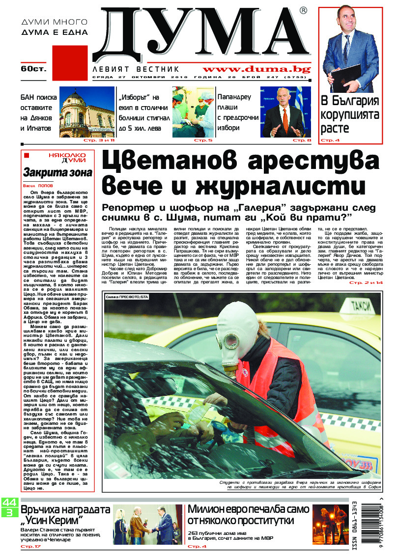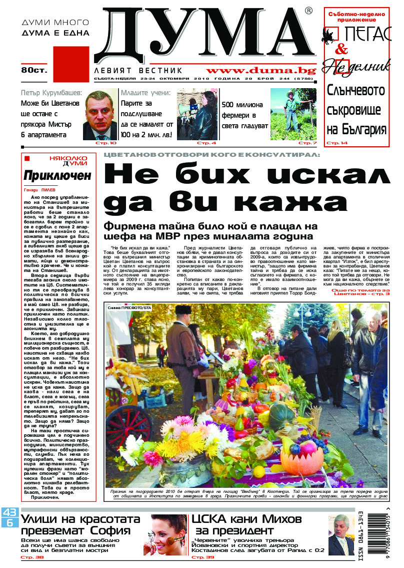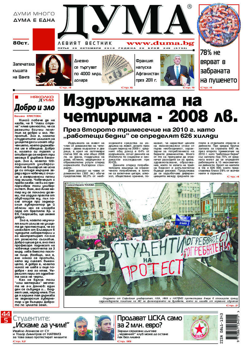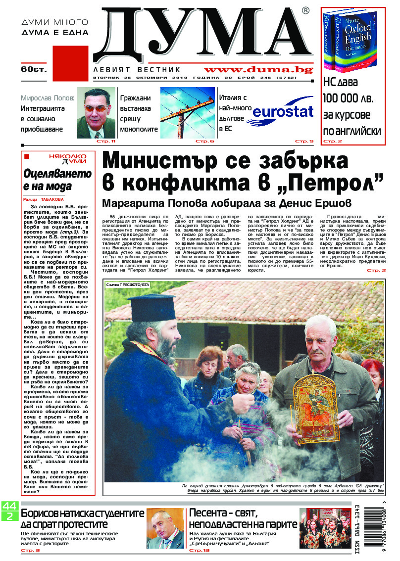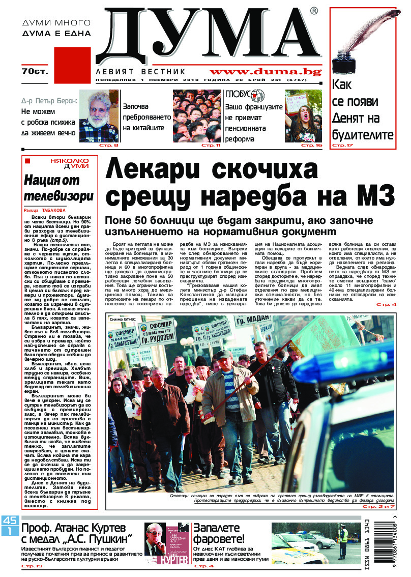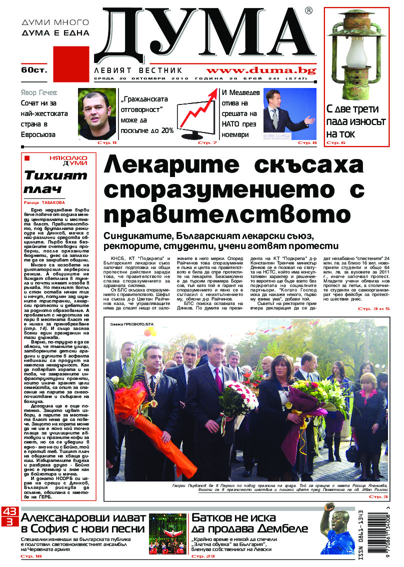 АБОНАМЕНТ за вестник „ДУМА“ за 2026 година. Можете да се абонирате в: „Български пощи“ АД до 15 декември 2025 г., „Доби прес“ ЕООД до 28 декември 2025 г., в редакцията на вестника до 20 декември 2025 г. Каталожен номер 6. Цени: 12 месеца - 149 € / 291,42 лв., 6 месеца - 75 € / 146,69 лв., 3 месеца - 40 € / 78,23 лв., 1 месец - 14 € / 27,38 лв. За повече информация тел. 02 9705 203 и 02 9705 216 отдел „Разпространение” на в-к ДУМА на ул. „Позитано” 20 А. E-mail: abonament@duma.bg АБОНАМЕНТ за вестник „ДУМА“ за 2026 година. Можете да се абонирате в: „Български пощи“ АД до 15 декември 2025 г., „Доби прес“ ЕООД до 28 декември 2025 г., в редакцията на вестника до 20 декември 2025 г. Каталожен номер 6. Цени: 12 месеца - 149 € / 291,42 лв., 6 месеца - 75 € / 146,69 лв., 3 месеца - 40 € / 78,23 лв., 1 месец - 14 € / 27,38 лв. За повече информация тел. 02 9705 203 и 02 9705 216 отдел „Разпространение” на в-к ДУМА на ул. „Позитано” 20 А. E-mail: abonament@duma.bg
