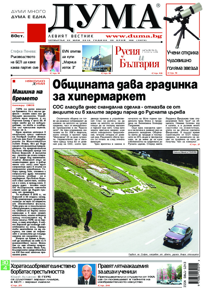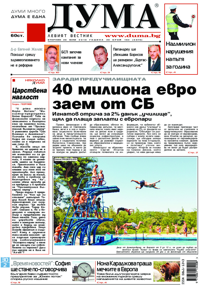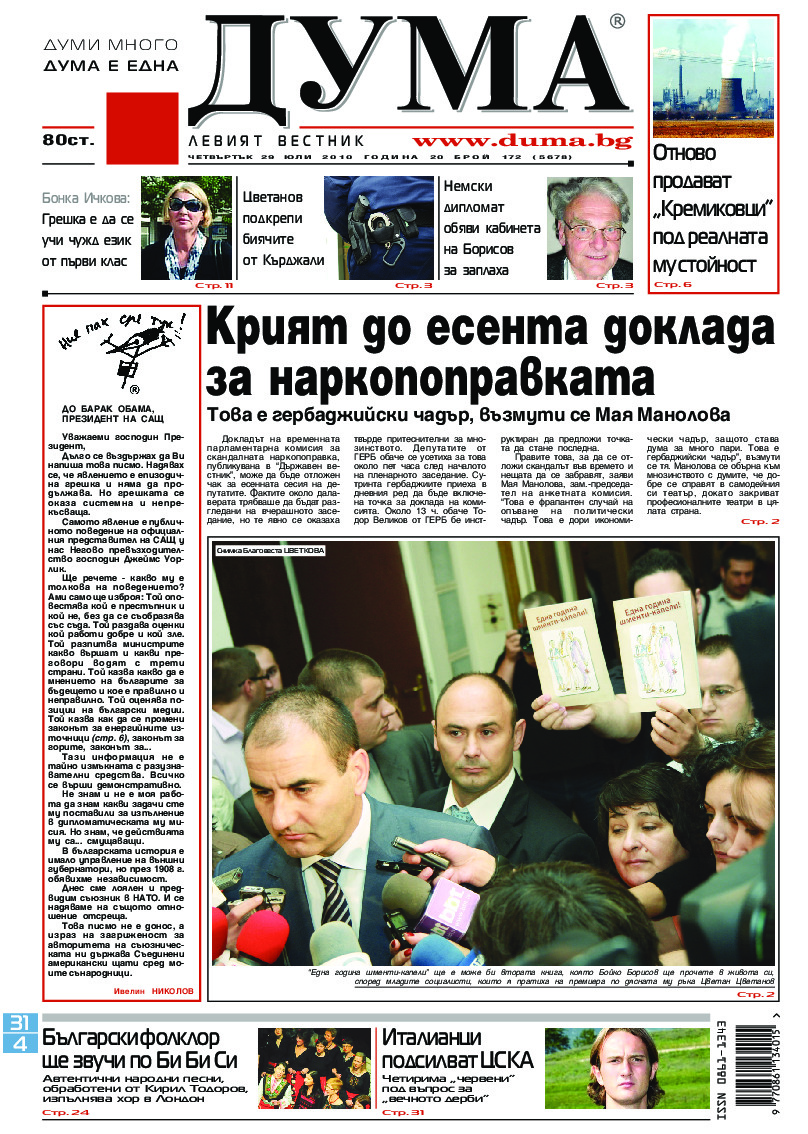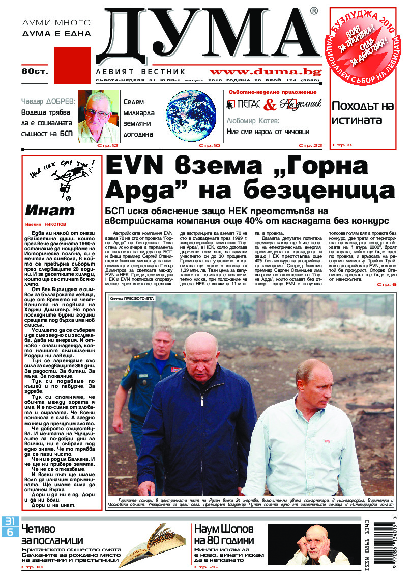 АБОНАМЕНТ за вестник „ДУМА“ за 2026 година. Можете да се абонирате в: „Български пощи“ АД до 15 декември 2025 г., „Доби прес“ ЕООД до 28 декември 2025 г., в редакцията на вестника до 20 декември 2025 г. Каталожен номер 6. Цени: 12 месеца - 149 € / 291,42 лв., 6 месеца - 75 € / 146,69 лв., 3 месеца - 40 € / 78,23 лв., 1 месец - 14 € / 27,38 лв. За повече информация тел. 02 9705 203 и 02 9705 216 отдел „Разпространение” на в-к ДУМА на ул. „Позитано” 20 А. E-mail: abonament@duma.bg АБОНАМЕНТ за вестник „ДУМА“ за 2026 година. Можете да се абонирате в: „Български пощи“ АД до 15 декември 2025 г., „Доби прес“ ЕООД до 28 декември 2025 г., в редакцията на вестника до 20 декември 2025 г. Каталожен номер 6. Цени: 12 месеца - 149 € / 291,42 лв., 6 месеца - 75 € / 146,69 лв., 3 месеца - 40 € / 78,23 лв., 1 месец - 14 € / 27,38 лв. За повече информация тел. 02 9705 203 и 02 9705 216 отдел „Разпространение” на в-к ДУМА на ул. „Позитано” 20 А. E-mail: abonament@duma.bg