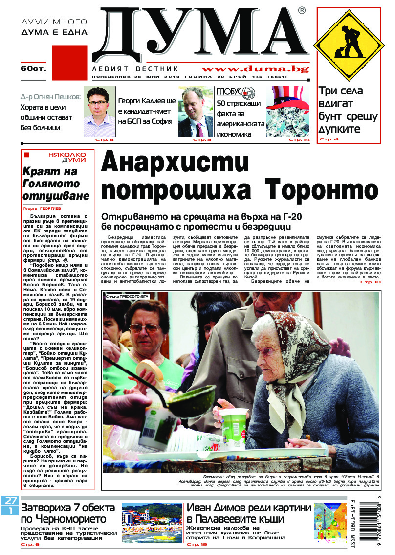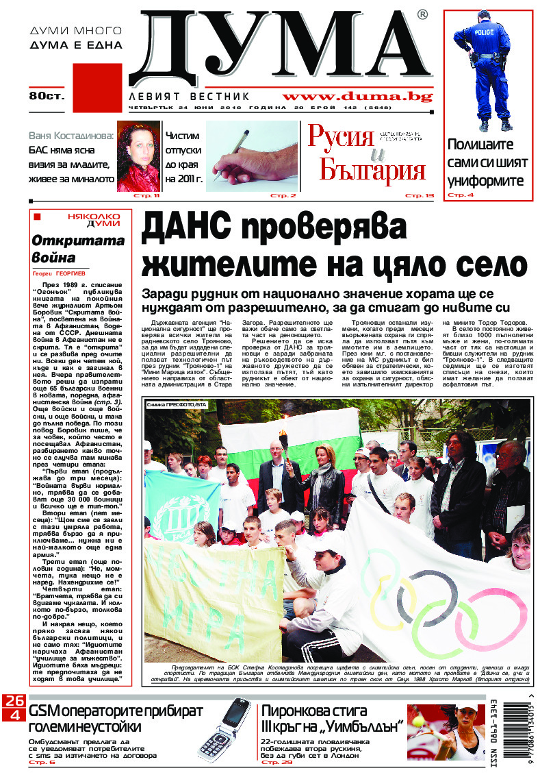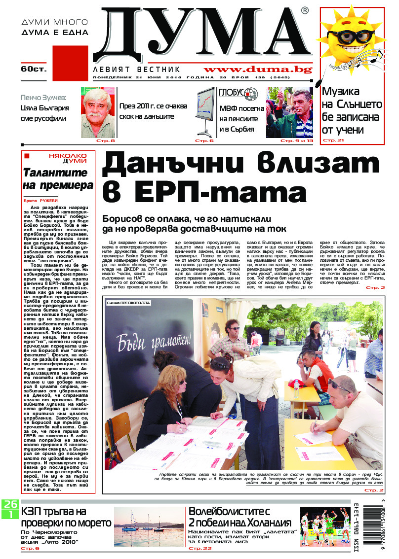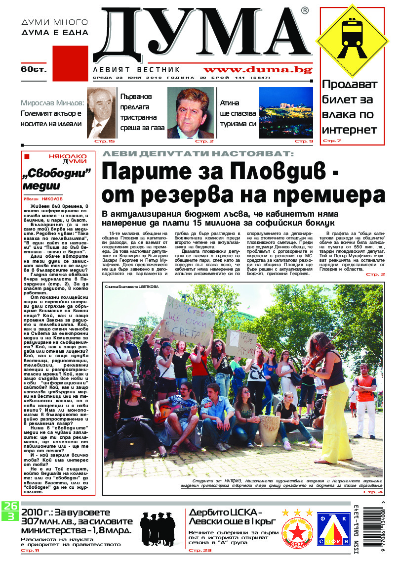 АБОНАМЕНТ за вестник „ДУМА“ за 2026 година. Можете да се абонирате в: „Български пощи“ АД до 15 декември 2025 г., „Доби прес“ ЕООД до 28 декември 2025 г., в редакцията на вестника до 20 декември 2025 г. Каталожен номер 6. Цени: 12 месеца - 149 € / 291,42 лв., 6 месеца - 75 € / 146,69 лв., 3 месеца - 40 € / 78,23 лв., 1 месец - 14 € / 27,38 лв. За повече информация тел. 02 9705 203 и 02 9705 216 отдел „Разпространение” на в-к ДУМА на ул. „Позитано” 20 А. E-mail: abonament@duma.bg АБОНАМЕНТ за вестник „ДУМА“ за 2026 година. Можете да се абонирате в: „Български пощи“ АД до 15 декември 2025 г., „Доби прес“ ЕООД до 28 декември 2025 г., в редакцията на вестника до 20 декември 2025 г. Каталожен номер 6. Цени: 12 месеца - 149 € / 291,42 лв., 6 месеца - 75 € / 146,69 лв., 3 месеца - 40 € / 78,23 лв., 1 месец - 14 € / 27,38 лв. За повече информация тел. 02 9705 203 и 02 9705 216 отдел „Разпространение” на в-к ДУМА на ул. „Позитано” 20 А. E-mail: abonament@duma.bg