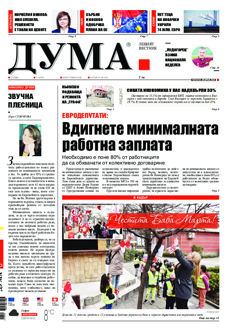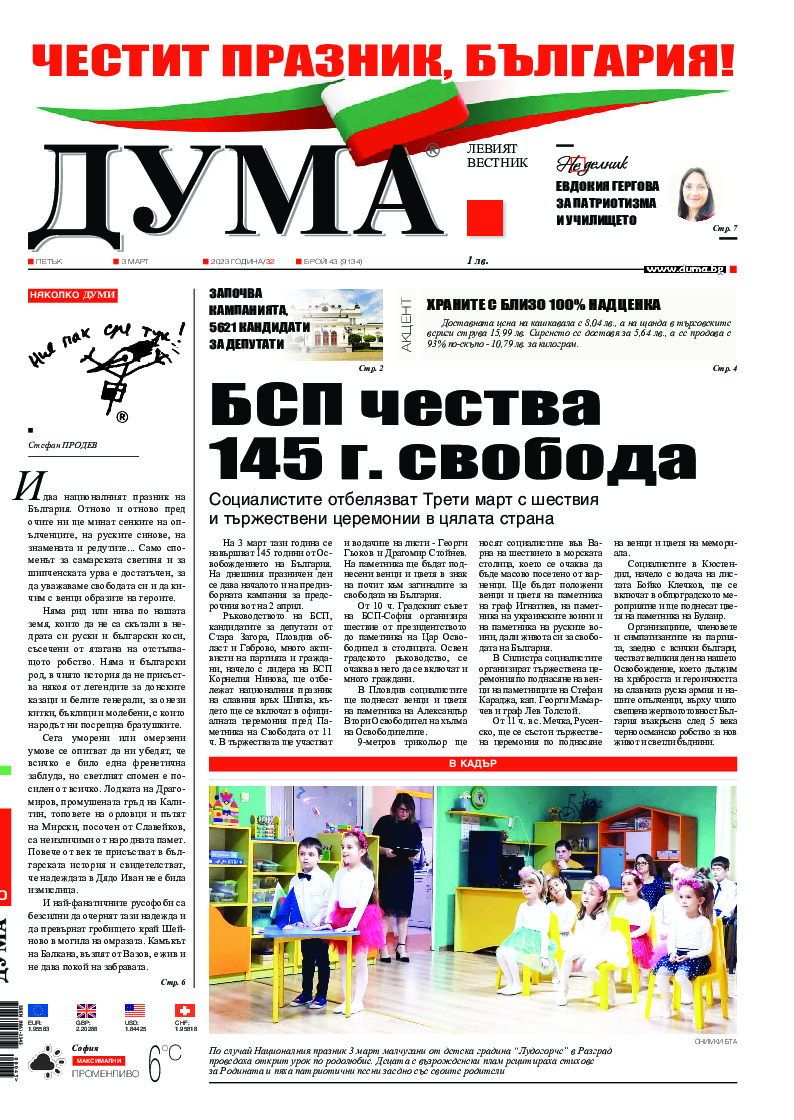 АБОНАМЕНТ за вестник „ДУМА“ за 2026 година. Можете да се абонирате в: „Български пощи“ АД до 15 декември 2025 г., „Доби прес“ ЕООД до 28 декември 2025 г., в редакцията на вестника до 20 декември 2025 г. Каталожен номер 6. Цени: 12 месеца - 149 € / 291,42 лв., 6 месеца - 75 € / 146,69 лв., 3 месеца - 40 € / 78,23 лв., 1 месец - 14 € / 27,38 лв. За повече информация тел. 02 9705 203 и 02 9705 216 отдел „Разпространение” на в-к ДУМА на ул. „Позитано” 20 А. E-mail: abonament@duma.bg АБОНАМЕНТ за вестник „ДУМА“ за 2026 година. Можете да се абонирате в: „Български пощи“ АД до 15 декември 2025 г., „Доби прес“ ЕООД до 28 декември 2025 г., в редакцията на вестника до 20 декември 2025 г. Каталожен номер 6. Цени: 12 месеца - 149 € / 291,42 лв., 6 месеца - 75 € / 146,69 лв., 3 месеца - 40 € / 78,23 лв., 1 месец - 14 € / 27,38 лв. За повече информация тел. 02 9705 203 и 02 9705 216 отдел „Разпространение” на в-к ДУМА на ул. „Позитано” 20 А. E-mail: abonament@duma.bg