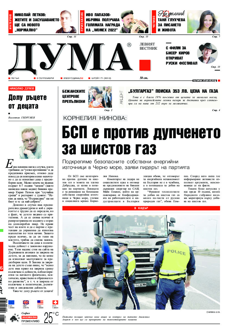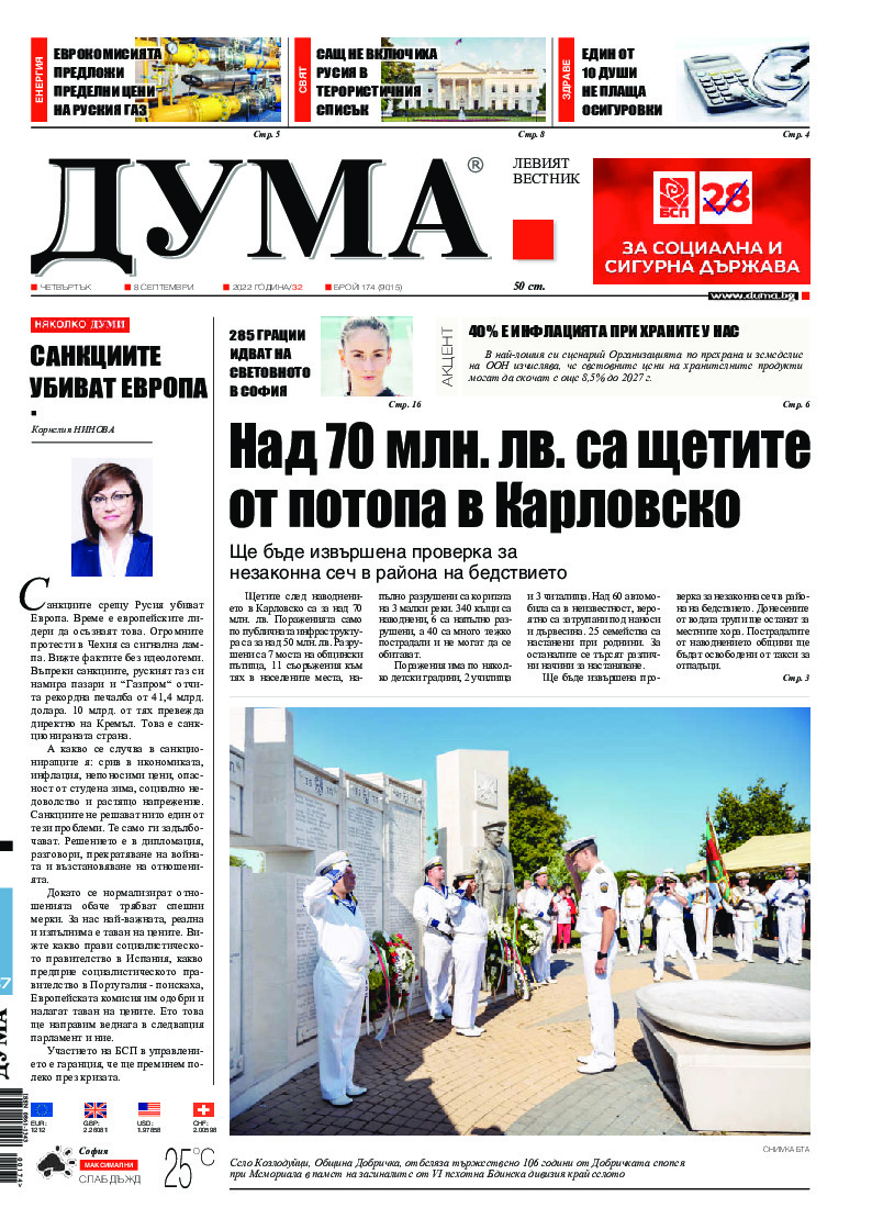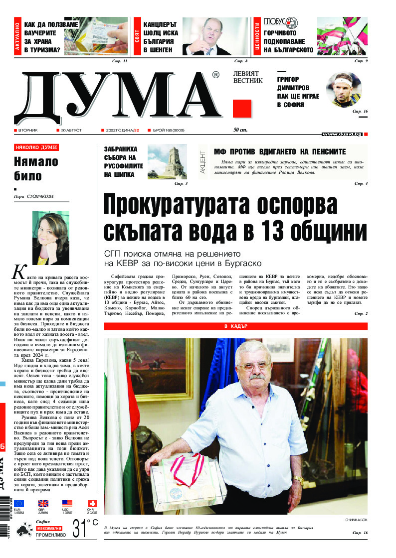 АБОНАМЕНТ за вестник „ДУМА“ за 2026 година. Можете да се абонирате в: „Български пощи“ АД до 15 декември 2025 г., „Доби прес“ ЕООД до 28 декември 2025 г., в редакцията на вестника до 20 декември 2025 г. Каталожен номер 6. Цени: 12 месеца - 149 € / 291,42 лв., 6 месеца - 75 € / 146,69 лв., 3 месеца - 40 € / 78,23 лв., 1 месец - 14 € / 27,38 лв. За повече информация тел. 02 9705 203 и 02 9705 216 отдел „Разпространение” на в-к ДУМА на ул. „Позитано” 20 А. E-mail: abonament@duma.bg АБОНАМЕНТ за вестник „ДУМА“ за 2026 година. Можете да се абонирате в: „Български пощи“ АД до 15 декември 2025 г., „Доби прес“ ЕООД до 28 декември 2025 г., в редакцията на вестника до 20 декември 2025 г. Каталожен номер 6. Цени: 12 месеца - 149 € / 291,42 лв., 6 месеца - 75 € / 146,69 лв., 3 месеца - 40 € / 78,23 лв., 1 месец - 14 € / 27,38 лв. За повече информация тел. 02 9705 203 и 02 9705 216 отдел „Разпространение” на в-к ДУМА на ул. „Позитано” 20 А. E-mail: abonament@duma.bg