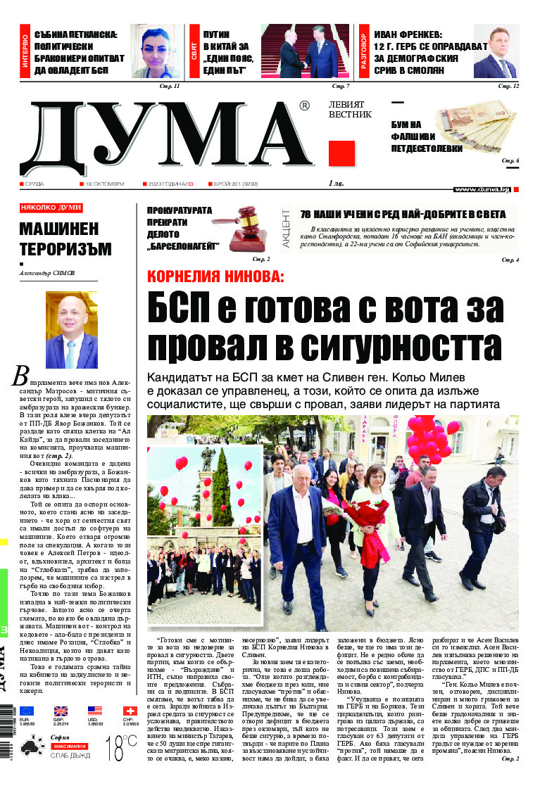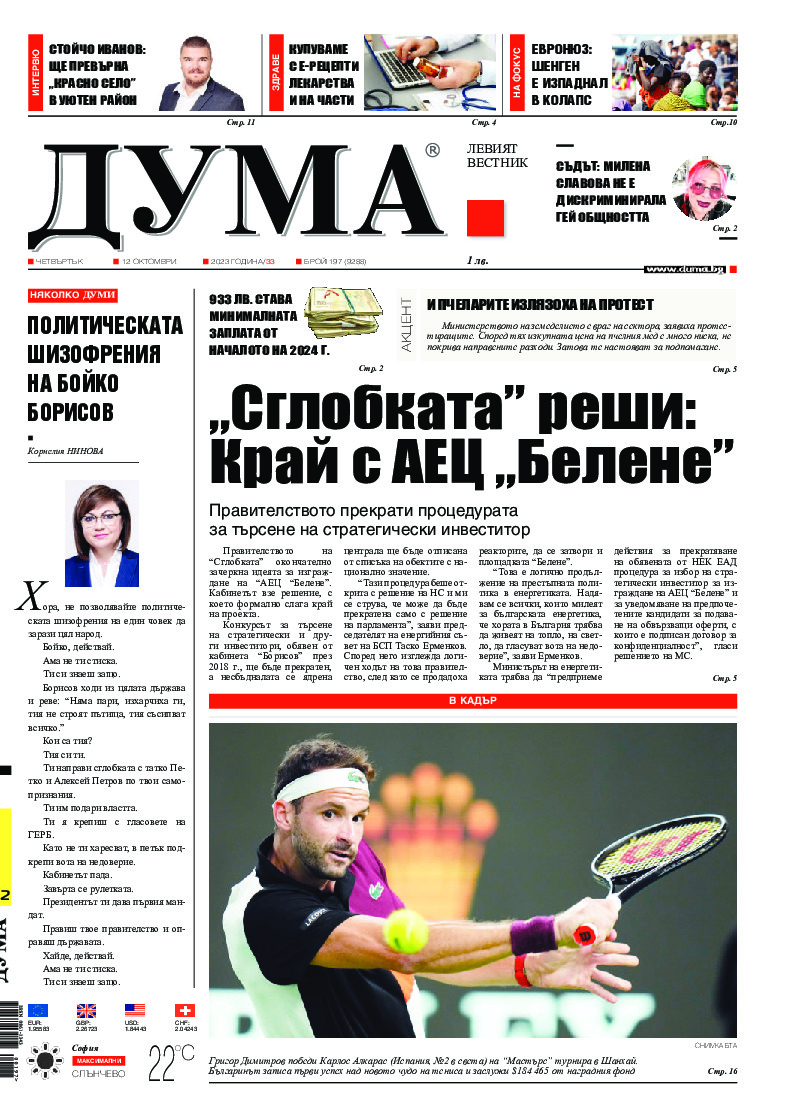 АБОНАМЕНТ за вестник „ДУМА“ за 2026 година. Можете да се абонирате в: „Български пощи“ АД до 15 декември 2025 г., „Доби прес“ ЕООД до 28 декември 2025 г., в редакцията на вестника до 20 декември 2025 г. Каталожен номер 6. Цени: 12 месеца - 149 € / 291,42 лв., 6 месеца - 75 € / 146,69 лв., 3 месеца - 40 € / 78,23 лв., 1 месец - 14 € / 27,38 лв. За повече информация тел. 02 9705 203 и 02 9705 216 отдел „Разпространение” на в-к ДУМА на ул. „Позитано” 20 А. E-mail: abonament@duma.bg АБОНАМЕНТ за вестник „ДУМА“ за 2026 година. Можете да се абонирате в: „Български пощи“ АД до 15 декември 2025 г., „Доби прес“ ЕООД до 28 декември 2025 г., в редакцията на вестника до 20 декември 2025 г. Каталожен номер 6. Цени: 12 месеца - 149 € / 291,42 лв., 6 месеца - 75 € / 146,69 лв., 3 месеца - 40 € / 78,23 лв., 1 месец - 14 € / 27,38 лв. За повече информация тел. 02 9705 203 и 02 9705 216 отдел „Разпространение” на в-к ДУМА на ул. „Позитано” 20 А. E-mail: abonament@duma.bg