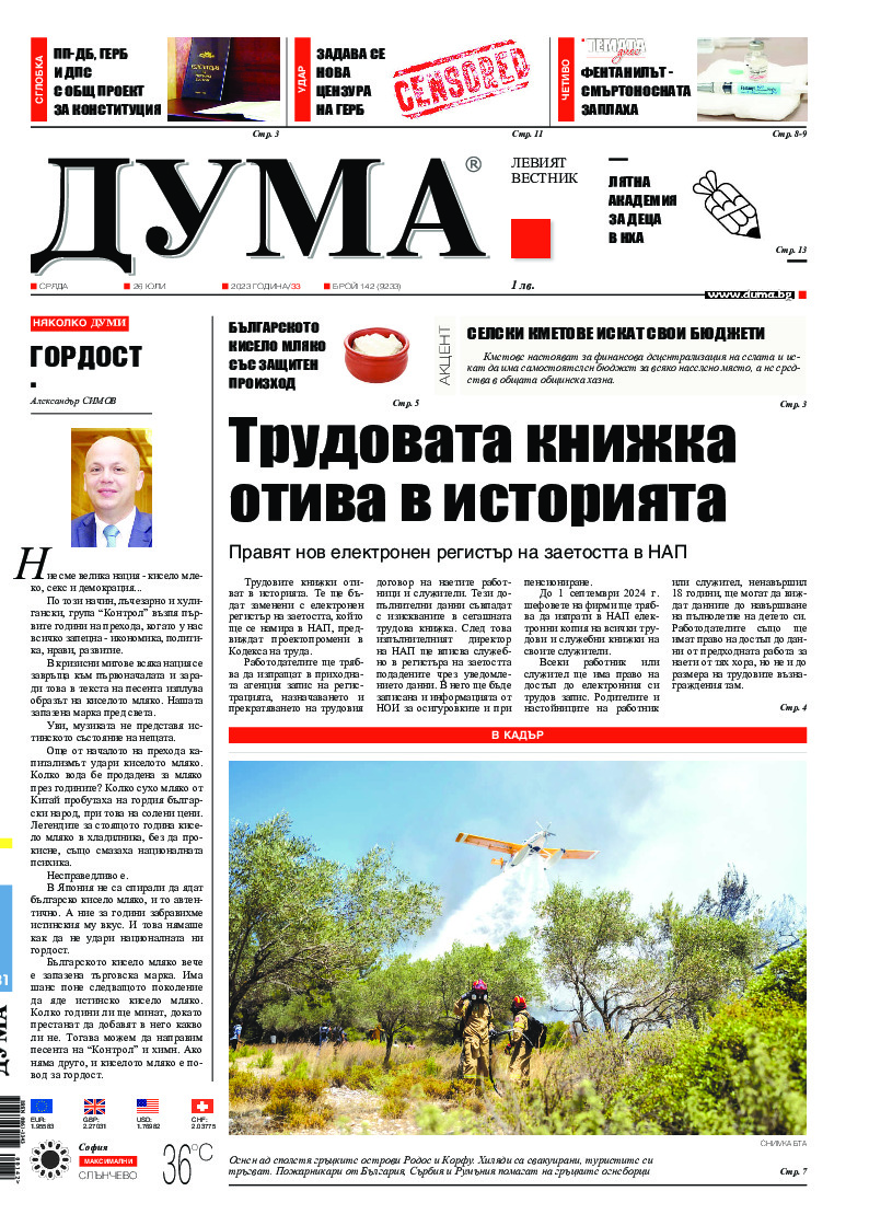 АБОНАМЕНТ за вестник „ДУМА“ за 2026 година. Можете да се абонирате в: „Български пощи“ АД до 15 декември 2025 г., „Доби прес“ ЕООД до 28 декември 2025 г., в редакцията на вестника до 20 декември 2025 г. Каталожен номер 6. Цени: 12 месеца - 149 € / 291,42 лв., 6 месеца - 75 € / 146,69 лв., 3 месеца - 40 € / 78,23 лв., 1 месец - 14 € / 27,38 лв. За повече информация тел. 02 9705 203 и 02 9705 216 отдел „Разпространение” на в-к ДУМА на ул. „Позитано” 20 А. E-mail: abonament@duma.bg АБОНАМЕНТ за вестник „ДУМА“ за 2026 година. Можете да се абонирате в: „Български пощи“ АД до 15 декември 2025 г., „Доби прес“ ЕООД до 28 декември 2025 г., в редакцията на вестника до 20 декември 2025 г. Каталожен номер 6. Цени: 12 месеца - 149 € / 291,42 лв., 6 месеца - 75 € / 146,69 лв., 3 месеца - 40 € / 78,23 лв., 1 месец - 14 € / 27,38 лв. За повече информация тел. 02 9705 203 и 02 9705 216 отдел „Разпространение” на в-к ДУМА на ул. „Позитано” 20 А. E-mail: abonament@duma.bg