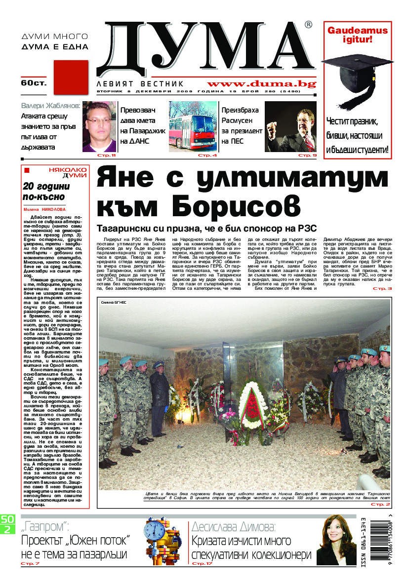 АБОНАМЕНТ за вестник „ДУМА“ за 2026 година. Можете да се абонирате в: „Български пощи“ АД до 15 декември 2025 г., „Доби прес“ ЕООД до 28 декември 2025 г., в редакцията на вестника до 20 декември 2025 г. Каталожен номер 6. Цени: 12 месеца - 149 € / 291,42 лв., 6 месеца - 75 € / 146,69 лв., 3 месеца - 40 € / 78,23 лв., 1 месец - 14 € / 27,38 лв. За повече информация тел. 02 9705 203 и 02 9705 216 отдел „Разпространение” на в-к ДУМА на ул. „Позитано” 20 А. E-mail: abonament@duma.bg АБОНАМЕНТ за вестник „ДУМА“ за 2026 година. Можете да се абонирате в: „Български пощи“ АД до 15 декември 2025 г., „Доби прес“ ЕООД до 28 декември 2025 г., в редакцията на вестника до 20 декември 2025 г. Каталожен номер 6. Цени: 12 месеца - 149 € / 291,42 лв., 6 месеца - 75 € / 146,69 лв., 3 месеца - 40 € / 78,23 лв., 1 месец - 14 € / 27,38 лв. За повече информация тел. 02 9705 203 и 02 9705 216 отдел „Разпространение” на в-к ДУМА на ул. „Позитано” 20 А. E-mail: abonament@duma.bg