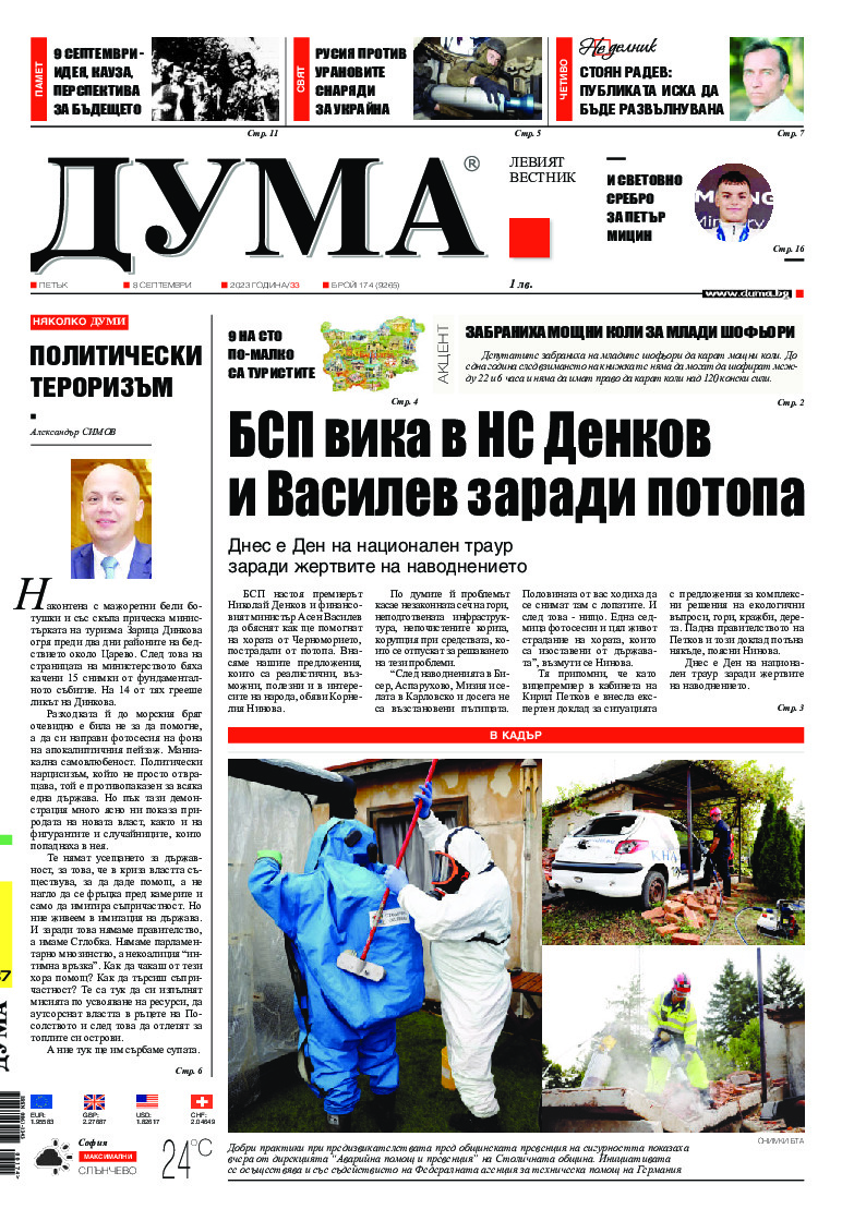 АБОНАМЕНТ за вестник „ДУМА“ за 2026 година. Можете да се абонирате в: „Български пощи“ АД до 15 декември 2025 г., „Доби прес“ ЕООД до 28 декември 2025 г., в редакцията на вестника до 20 декември 2025 г. Каталожен номер 6. Цени: 12 месеца - 149 € / 291,42 лв., 6 месеца - 75 € / 146,69 лв., 3 месеца - 40 € / 78,23 лв., 1 месец - 14 € / 27,38 лв. За повече информация тел. 02 9705 203 и 02 9705 216 отдел „Разпространение” на в-к ДУМА на ул. „Позитано” 20 А. E-mail: abonament@duma.bg АБОНАМЕНТ за вестник „ДУМА“ за 2026 година. Можете да се абонирате в: „Български пощи“ АД до 15 декември 2025 г., „Доби прес“ ЕООД до 28 декември 2025 г., в редакцията на вестника до 20 декември 2025 г. Каталожен номер 6. Цени: 12 месеца - 149 € / 291,42 лв., 6 месеца - 75 € / 146,69 лв., 3 месеца - 40 € / 78,23 лв., 1 месец - 14 € / 27,38 лв. За повече информация тел. 02 9705 203 и 02 9705 216 отдел „Разпространение” на в-к ДУМА на ул. „Позитано” 20 А. E-mail: abonament@duma.bg