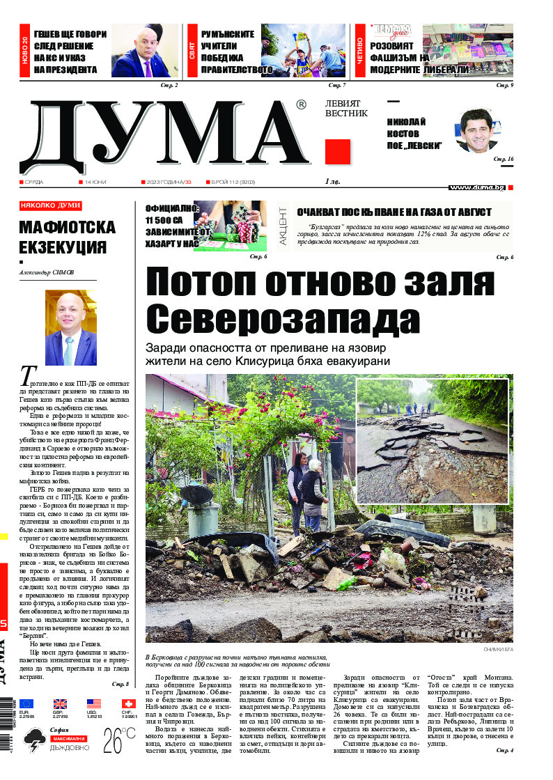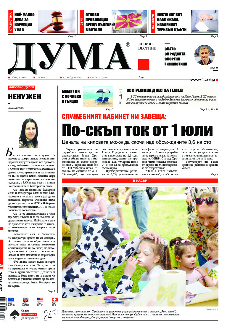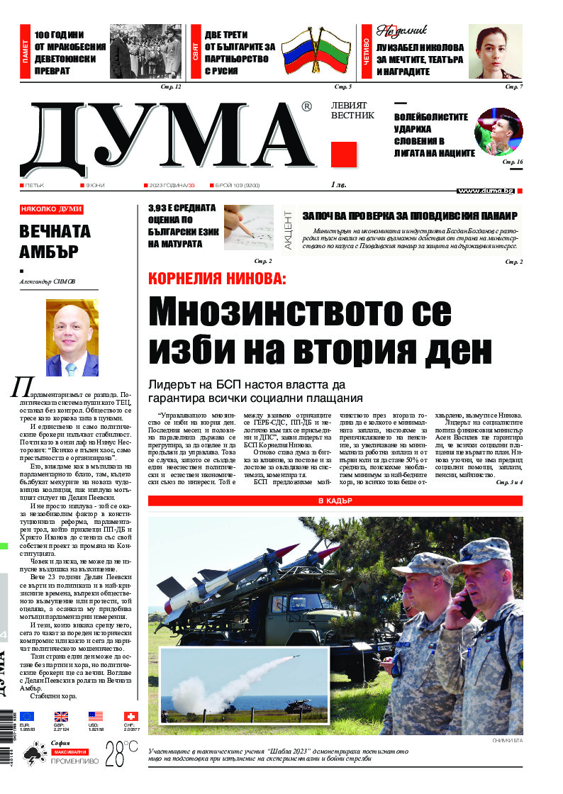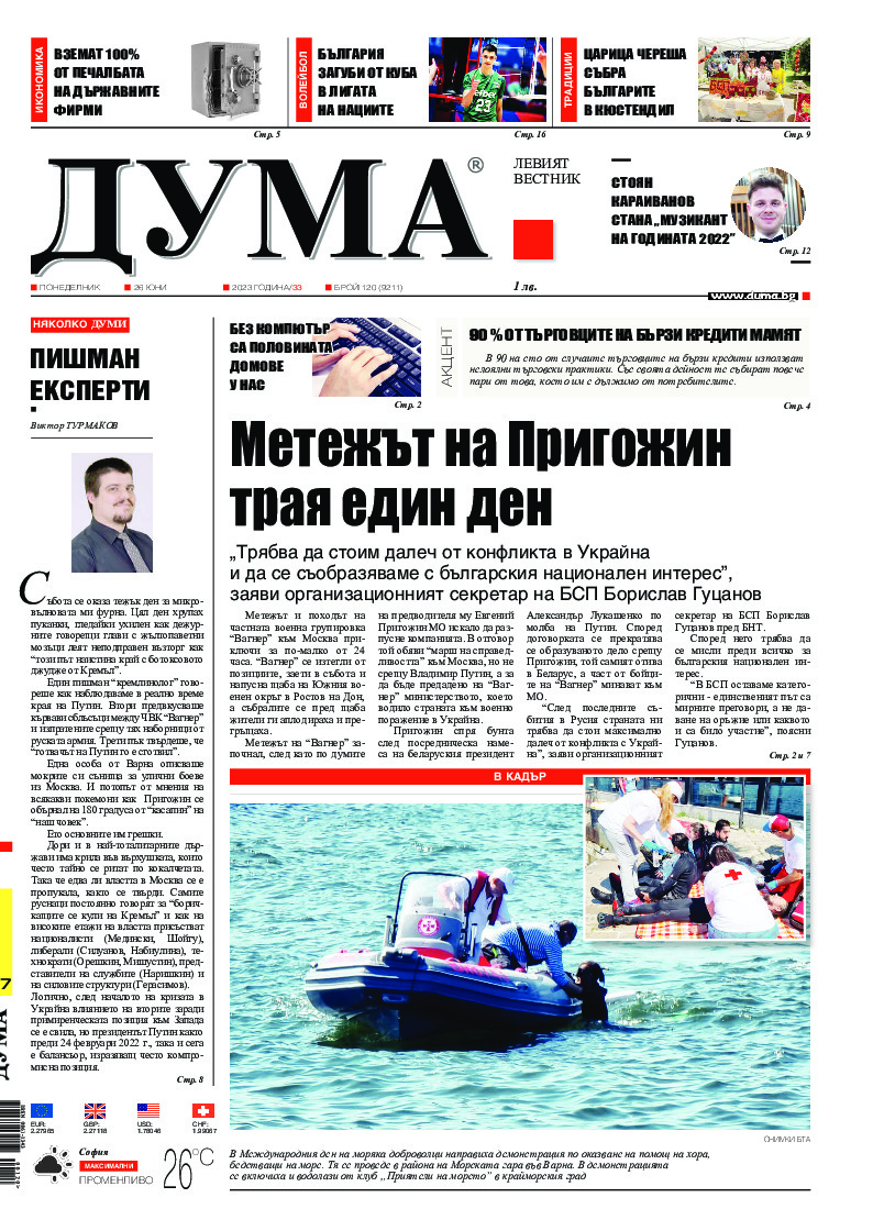АБОНАМЕНТ за вестник „ДУМА“ за 2026 година. Можете да се абонирате в: „Български пощи“ АД до 15 декември 2025 г., „Доби прес“ ЕООД до 28 декември 2025 г., в редакцията на вестника до 20 декември 2025 г. Каталожен номер 6. Цени: 12 месеца - 149 € / 291,42 лв., 6 месеца - 75 € / 146,69 лв., 3 месеца - 40 € / 78,23 лв., 1 месец - 14 € / 27,38 лв. За повече информация тел. 02 9705 203 и 02 9705 216 отдел „Разпространение” на в-к ДУМА на ул. „Позитано” 20 А. E-mail: abonament@duma.bg АБОНАМЕНТ за вестник „ДУМА“ за 2026 година. Можете да се абонирате в: „Български пощи“ АД до 15 декември 2025 г., „Доби прес“ ЕООД до 28 декември 2025 г., в редакцията на вестника до 20 декември 2025 г. Каталожен номер 6. Цени: 12 месеца - 149 € / 291,42 лв., 6 месеца - 75 € / 146,69 лв., 3 месеца - 40 € / 78,23 лв., 1 месец - 14 € / 27,38 лв. За повече информация тел. 02 9705 203 и 02 9705 216 отдел „Разпространение” на в-к ДУМА на ул. „Позитано” 20 А. E-mail: abonament@duma.bg
