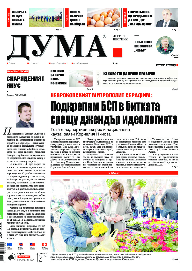 АБОНАМЕНТ за вестник „ДУМА“ за 2026 година. Можете да се абонирате в: „Български пощи“ АД до 15 декември 2025 г., „Доби прес“ ЕООД до 28 декември 2025 г., в редакцията на вестника до 20 декември 2025 г. Каталожен номер 6. Цени: 12 месеца - 149 € / 291,42 лв., 6 месеца - 75 € / 146,69 лв., 3 месеца - 40 € / 78,23 лв., 1 месец - 14 € / 27,38 лв. За повече информация тел. 02 9705 203 и 02 9705 216 отдел „Разпространение” на в-к ДУМА на ул. „Позитано” 20 А. E-mail: abonament@duma.bg АБОНАМЕНТ за вестник „ДУМА“ за 2026 година. Можете да се абонирате в: „Български пощи“ АД до 15 декември 2025 г., „Доби прес“ ЕООД до 28 декември 2025 г., в редакцията на вестника до 20 декември 2025 г. Каталожен номер 6. Цени: 12 месеца - 149 € / 291,42 лв., 6 месеца - 75 € / 146,69 лв., 3 месеца - 40 € / 78,23 лв., 1 месец - 14 € / 27,38 лв. За повече информация тел. 02 9705 203 и 02 9705 216 отдел „Разпространение” на в-к ДУМА на ул. „Позитано” 20 А. E-mail: abonament@duma.bg
