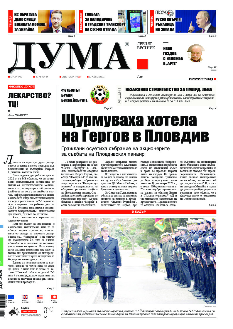 АБОНАМЕНТ за вестник „ДУМА“ за 2026 година. Можете да се абонирате в: „Български пощи“ АД до 15 декември 2025 г., „Доби прес“ ЕООД до 28 декември 2025 г., в редакцията на вестника до 20 декември 2025 г. Каталожен номер 6. Цени: 12 месеца - 149 € / 291,42 лв., 6 месеца - 75 € / 146,69 лв., 3 месеца - 40 € / 78,23 лв., 1 месец - 14 € / 27,38 лв. За повече информация тел. 02 9705 203 и 02 9705 216 отдел „Разпространение” на в-к ДУМА на ул. „Позитано” 20 А. E-mail: abonament@duma.bg АБОНАМЕНТ за вестник „ДУМА“ за 2026 година. Можете да се абонирате в: „Български пощи“ АД до 15 декември 2025 г., „Доби прес“ ЕООД до 28 декември 2025 г., в редакцията на вестника до 20 декември 2025 г. Каталожен номер 6. Цени: 12 месеца - 149 € / 291,42 лв., 6 месеца - 75 € / 146,69 лв., 3 месеца - 40 € / 78,23 лв., 1 месец - 14 € / 27,38 лв. За повече информация тел. 02 9705 203 и 02 9705 216 отдел „Разпространение” на в-к ДУМА на ул. „Позитано” 20 А. E-mail: abonament@duma.bg