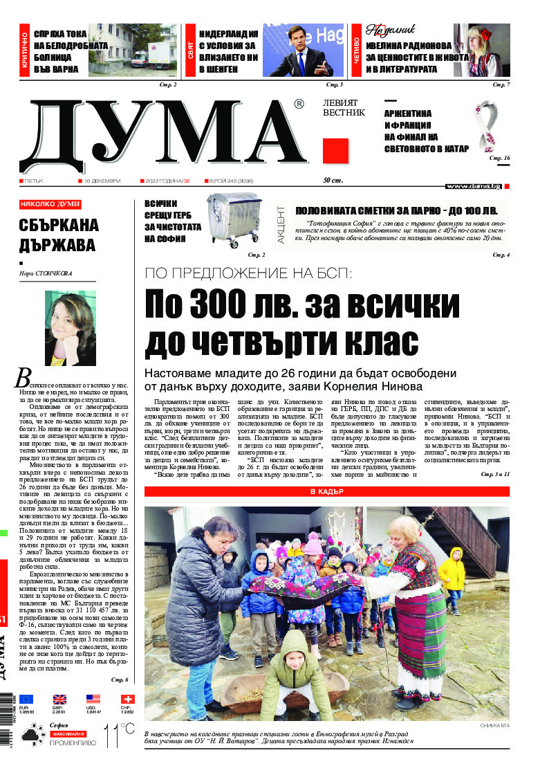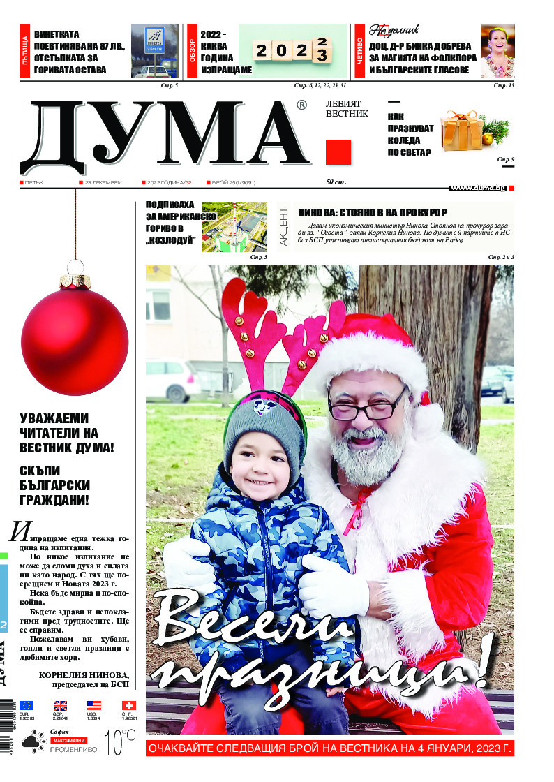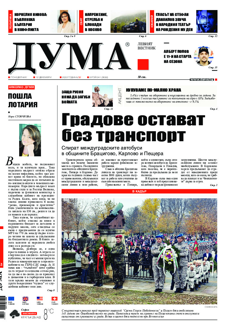 АБОНАМЕНТ за вестник „ДУМА“ за 2026 година. Можете да се абонирате в: „Български пощи“ АД до 15 декември 2025 г., „Доби прес“ ЕООД до 28 декември 2025 г., в редакцията на вестника до 20 декември 2025 г. Каталожен номер 6. Цени: 12 месеца - 149 € / 291,42 лв., 6 месеца - 75 € / 146,69 лв., 3 месеца - 40 € / 78,23 лв., 1 месец - 14 € / 27,38 лв. За повече информация тел. 02 9705 203 и 02 9705 216 отдел „Разпространение” на в-к ДУМА на ул. „Позитано” 20 А. E-mail: abonament@duma.bg АБОНАМЕНТ за вестник „ДУМА“ за 2026 година. Можете да се абонирате в: „Български пощи“ АД до 15 декември 2025 г., „Доби прес“ ЕООД до 28 декември 2025 г., в редакцията на вестника до 20 декември 2025 г. Каталожен номер 6. Цени: 12 месеца - 149 € / 291,42 лв., 6 месеца - 75 € / 146,69 лв., 3 месеца - 40 € / 78,23 лв., 1 месец - 14 € / 27,38 лв. За повече информация тел. 02 9705 203 и 02 9705 216 отдел „Разпространение” на в-к ДУМА на ул. „Позитано” 20 А. E-mail: abonament@duma.bg