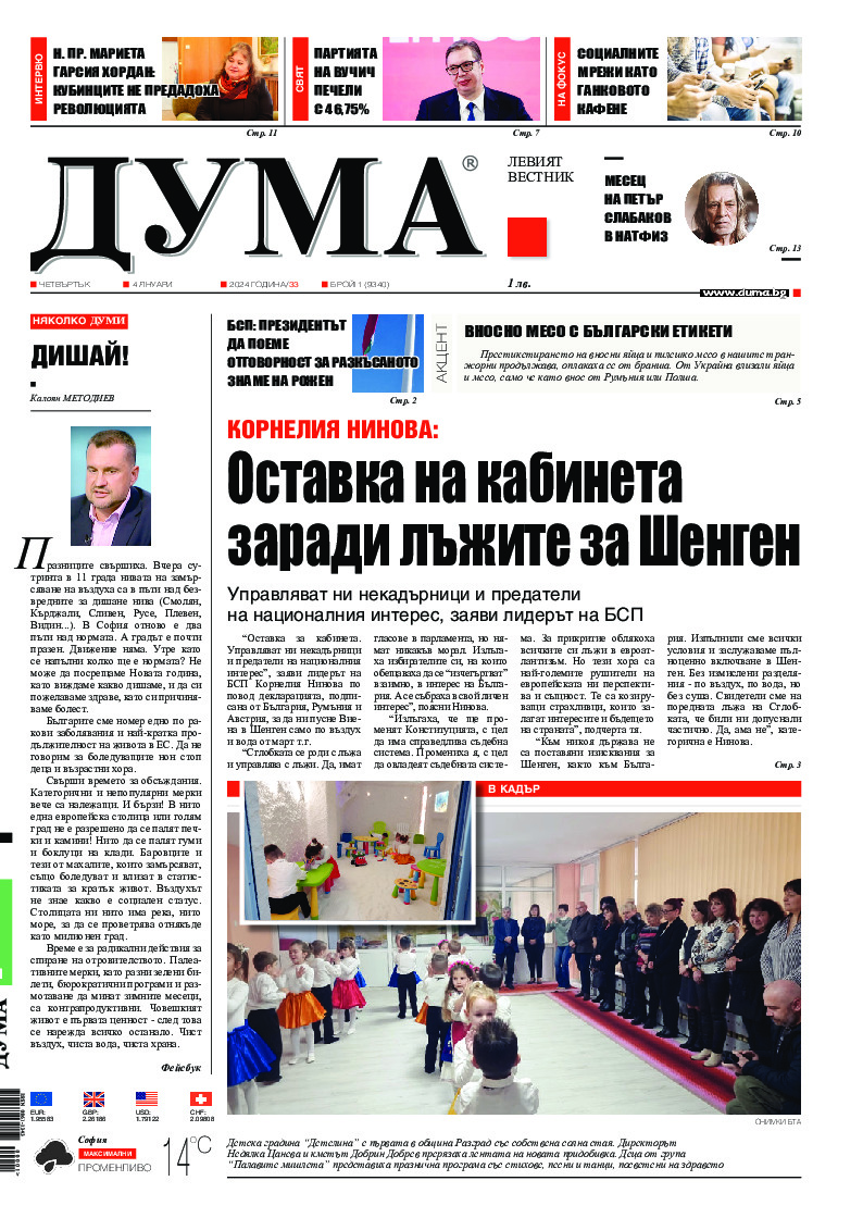 АБОНАМЕНТ за вестник „ДУМА“ за 2026 година. Можете да се абонирате в: „Български пощи“ АД до 15 декември 2025 г., „Доби прес“ ЕООД до 28 декември 2025 г., в редакцията на вестника до 20 декември 2025 г. Каталожен номер 6. Цени: 12 месеца - 149 € / 291,42 лв., 6 месеца - 75 € / 146,69 лв., 3 месеца - 40 € / 78,23 лв., 1 месец - 14 € / 27,38 лв. За повече информация тел. 02 9705 203 и 02 9705 216 отдел „Разпространение” на в-к ДУМА на ул. „Позитано” 20 А. E-mail: abonament@duma.bg АБОНАМЕНТ за вестник „ДУМА“ за 2026 година. Можете да се абонирате в: „Български пощи“ АД до 15 декември 2025 г., „Доби прес“ ЕООД до 28 декември 2025 г., в редакцията на вестника до 20 декември 2025 г. Каталожен номер 6. Цени: 12 месеца - 149 € / 291,42 лв., 6 месеца - 75 € / 146,69 лв., 3 месеца - 40 € / 78,23 лв., 1 месец - 14 € / 27,38 лв. За повече информация тел. 02 9705 203 и 02 9705 216 отдел „Разпространение” на в-к ДУМА на ул. „Позитано” 20 А. E-mail: abonament@duma.bg