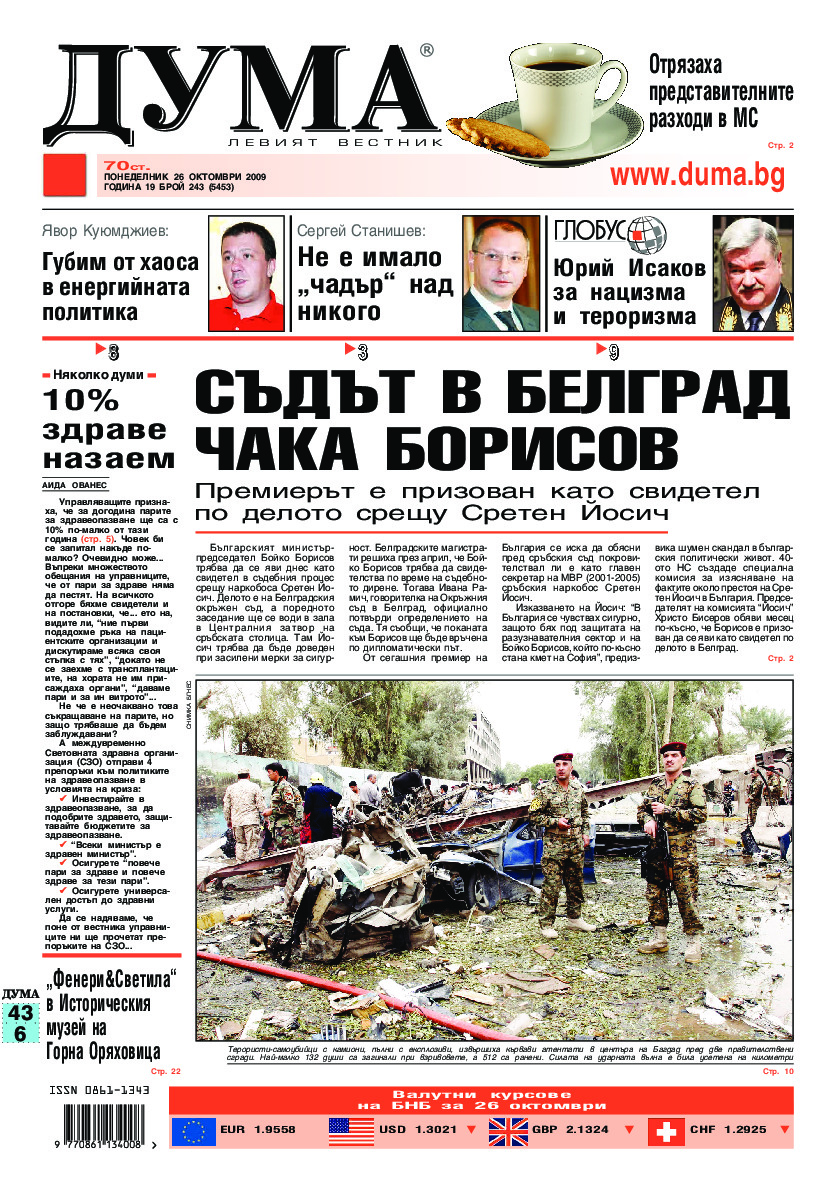 АБОНАМЕНТ за вестник „ДУМА“ за 2026 година. Можете да се абонирате в: „Български пощи“ АД до 15 декември 2025 г., „Доби прес“ ЕООД до 28 декември 2025 г., в редакцията на вестника до 20 декември 2025 г. Каталожен номер 6. Цени: 12 месеца - 149 € / 291,42 лв., 6 месеца - 75 € / 146,69 лв., 3 месеца - 40 € / 78,23 лв., 1 месец - 14 € / 27,38 лв. За повече информация тел. 02 9705 203 и 02 9705 216 отдел „Разпространение” на в-к ДУМА на ул. „Позитано” 20 А. E-mail: abonament@duma.bg АБОНАМЕНТ за вестник „ДУМА“ за 2026 година. Можете да се абонирате в: „Български пощи“ АД до 15 декември 2025 г., „Доби прес“ ЕООД до 28 декември 2025 г., в редакцията на вестника до 20 декември 2025 г. Каталожен номер 6. Цени: 12 месеца - 149 € / 291,42 лв., 6 месеца - 75 € / 146,69 лв., 3 месеца - 40 € / 78,23 лв., 1 месец - 14 € / 27,38 лв. За повече информация тел. 02 9705 203 и 02 9705 216 отдел „Разпространение” на в-к ДУМА на ул. „Позитано” 20 А. E-mail: abonament@duma.bg