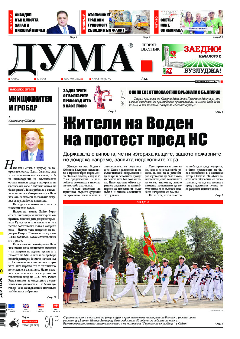 АБОНАМЕНТ за вестник „ДУМА“ за 2026 година. Можете да се абонирате в: „Български пощи“ АД до 15 декември 2025 г., „Доби прес“ ЕООД до 28 декември 2025 г., в редакцията на вестника до 20 декември 2025 г. Каталожен номер 6. Цени: 12 месеца - 149 € / 291,42 лв., 6 месеца - 75 € / 146,69 лв., 3 месеца - 40 € / 78,23 лв., 1 месец - 14 € / 27,38 лв. За повече информация тел. 02 9705 203 и 02 9705 216 отдел „Разпространение” на в-к ДУМА на ул. „Позитано” 20 А. E-mail: abonament@duma.bg АБОНАМЕНТ за вестник „ДУМА“ за 2026 година. Можете да се абонирате в: „Български пощи“ АД до 15 декември 2025 г., „Доби прес“ ЕООД до 28 декември 2025 г., в редакцията на вестника до 20 декември 2025 г. Каталожен номер 6. Цени: 12 месеца - 149 € / 291,42 лв., 6 месеца - 75 € / 146,69 лв., 3 месеца - 40 € / 78,23 лв., 1 месец - 14 € / 27,38 лв. За повече информация тел. 02 9705 203 и 02 9705 216 отдел „Разпространение” на в-к ДУМА на ул. „Позитано” 20 А. E-mail: abonament@duma.bg