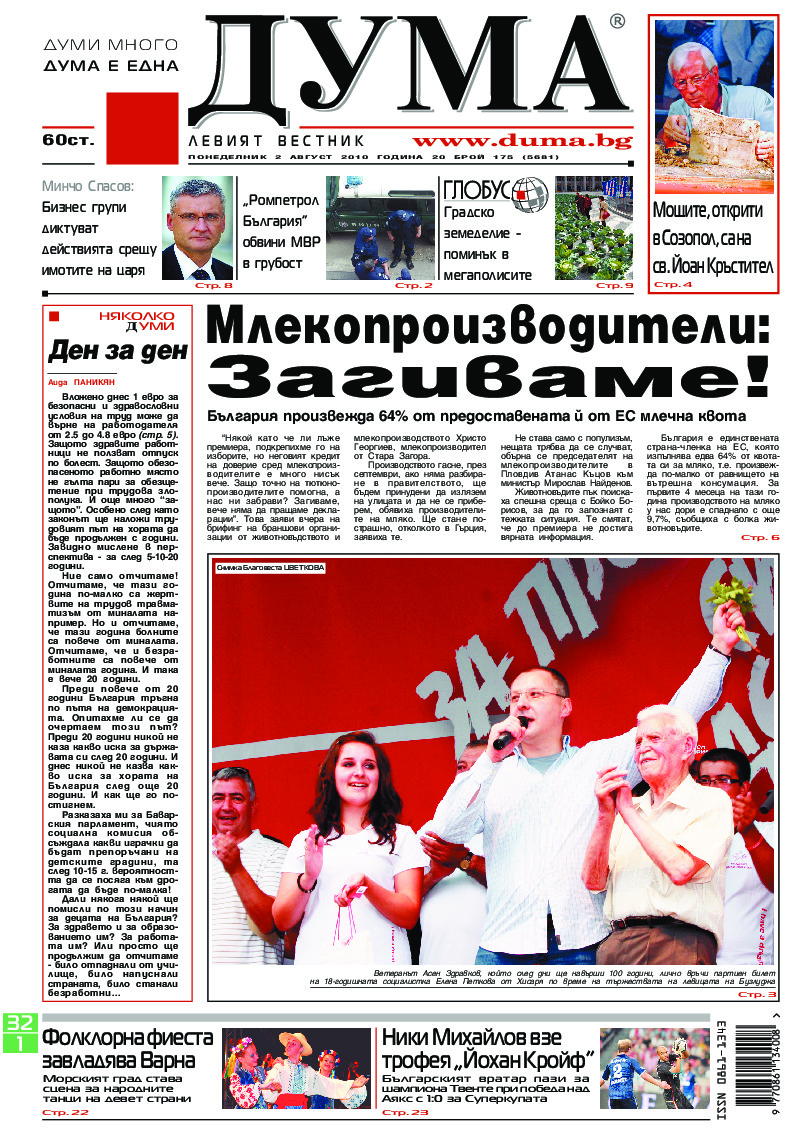 АБОНАМЕНТ за вестник „ДУМА“ за 2026 година. Можете да се абонирате в: „Български пощи“ АД до 15 декември 2025 г., „Доби прес“ ЕООД до 28 декември 2025 г., в редакцията на вестника до 20 декември 2025 г. Каталожен номер 6. Цени: 12 месеца - 149 € / 291,42 лв., 6 месеца - 75 € / 146,69 лв., 3 месеца - 40 € / 78,23 лв., 1 месец - 14 € / 27,38 лв. За повече информация тел. 02 9705 203 и 02 9705 216 отдел „Разпространение” на в-к ДУМА на ул. „Позитано” 20 А. E-mail: abonament@duma.bg АБОНАМЕНТ за вестник „ДУМА“ за 2026 година. Можете да се абонирате в: „Български пощи“ АД до 15 декември 2025 г., „Доби прес“ ЕООД до 28 декември 2025 г., в редакцията на вестника до 20 декември 2025 г. Каталожен номер 6. Цени: 12 месеца - 149 € / 291,42 лв., 6 месеца - 75 € / 146,69 лв., 3 месеца - 40 € / 78,23 лв., 1 месец - 14 € / 27,38 лв. За повече информация тел. 02 9705 203 и 02 9705 216 отдел „Разпространение” на в-к ДУМА на ул. „Позитано” 20 А. E-mail: abonament@duma.bg