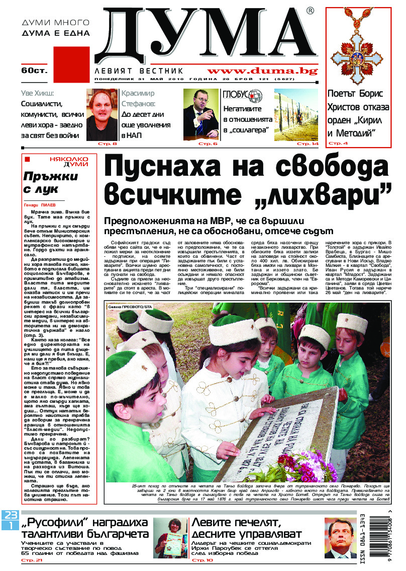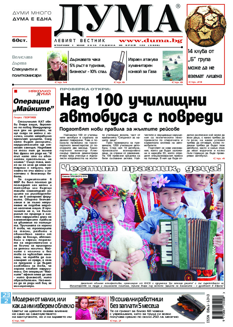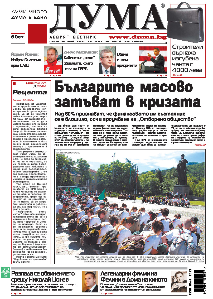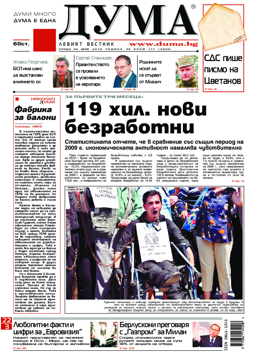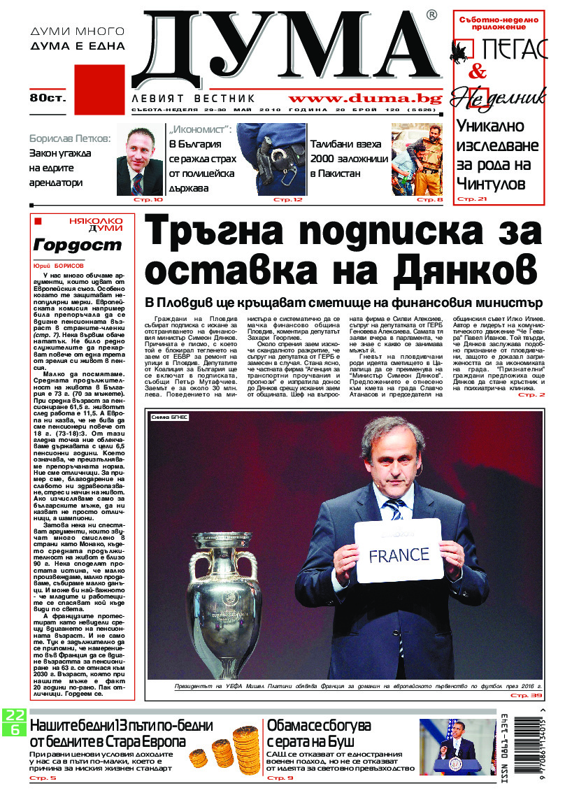 АБОНАМЕНТ за вестник „ДУМА“ за 2026 година. Можете да се абонирате в: „Български пощи“ АД до 15 декември 2025 г., „Доби прес“ ЕООД до 28 декември 2025 г., в редакцията на вестника до 20 декември 2025 г. Каталожен номер 6. Цени: 12 месеца - 149 € / 291,42 лв., 6 месеца - 75 € / 146,69 лв., 3 месеца - 40 € / 78,23 лв., 1 месец - 14 € / 27,38 лв. За повече информация тел. 02 9705 203 и 02 9705 216 отдел „Разпространение” на в-к ДУМА на ул. „Позитано” 20 А. E-mail: abonament@duma.bg АБОНАМЕНТ за вестник „ДУМА“ за 2026 година. Можете да се абонирате в: „Български пощи“ АД до 15 декември 2025 г., „Доби прес“ ЕООД до 28 декември 2025 г., в редакцията на вестника до 20 декември 2025 г. Каталожен номер 6. Цени: 12 месеца - 149 € / 291,42 лв., 6 месеца - 75 € / 146,69 лв., 3 месеца - 40 € / 78,23 лв., 1 месец - 14 € / 27,38 лв. За повече информация тел. 02 9705 203 и 02 9705 216 отдел „Разпространение” на в-к ДУМА на ул. „Позитано” 20 А. E-mail: abonament@duma.bg