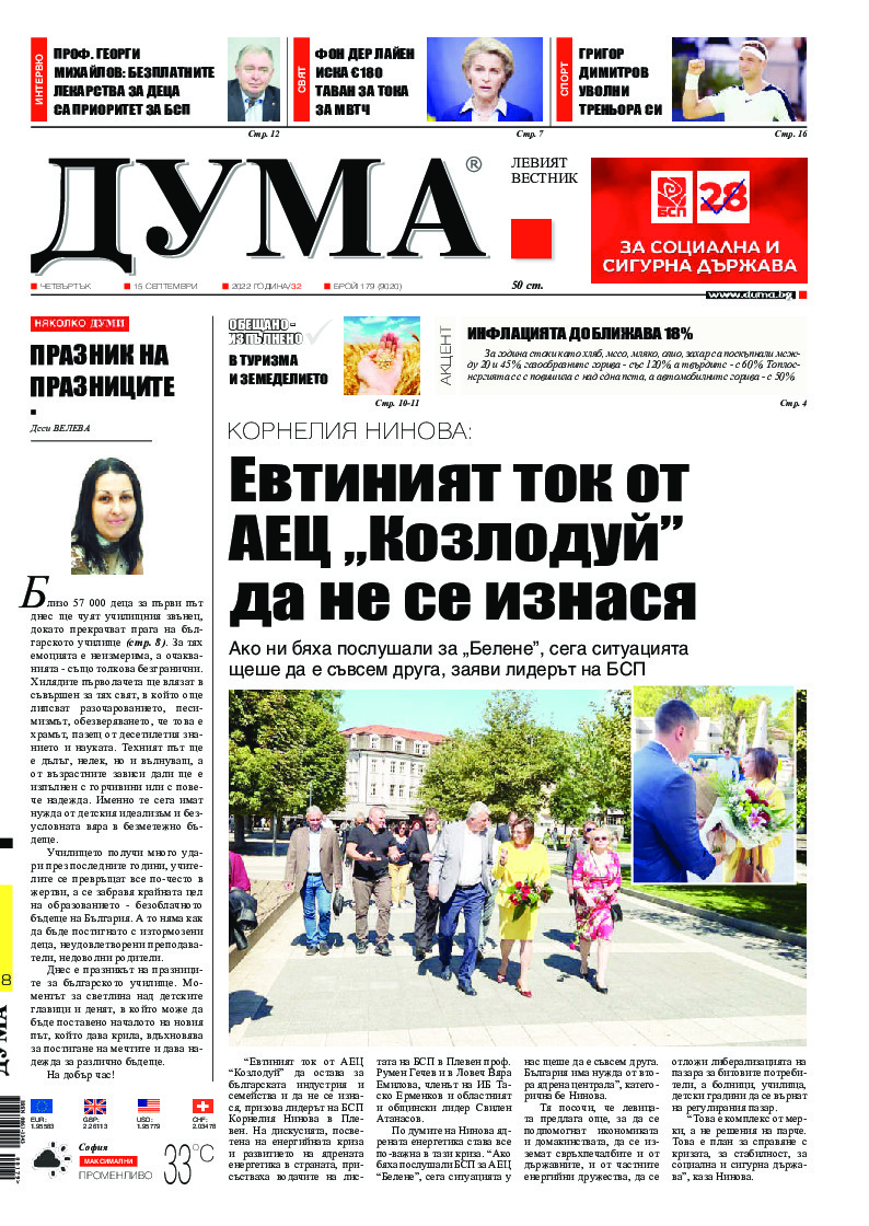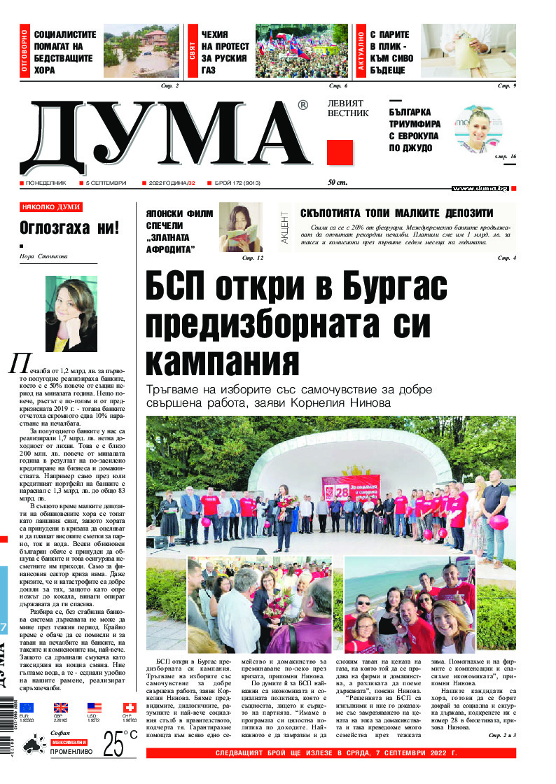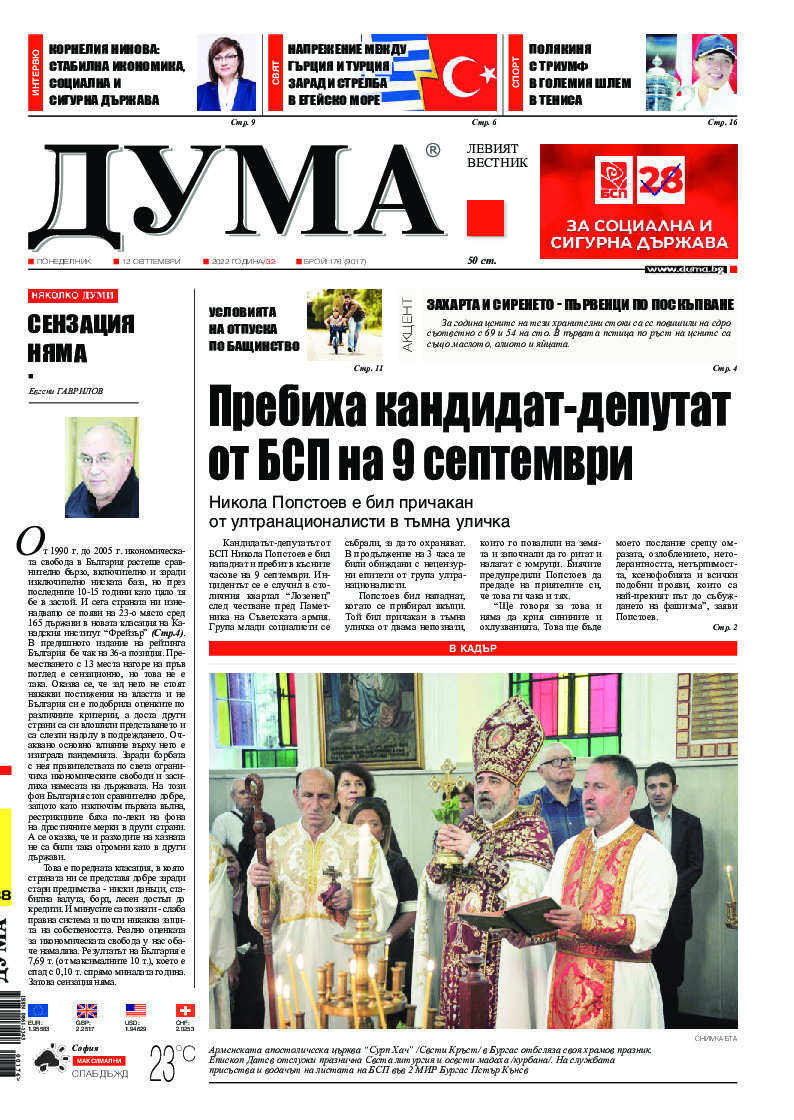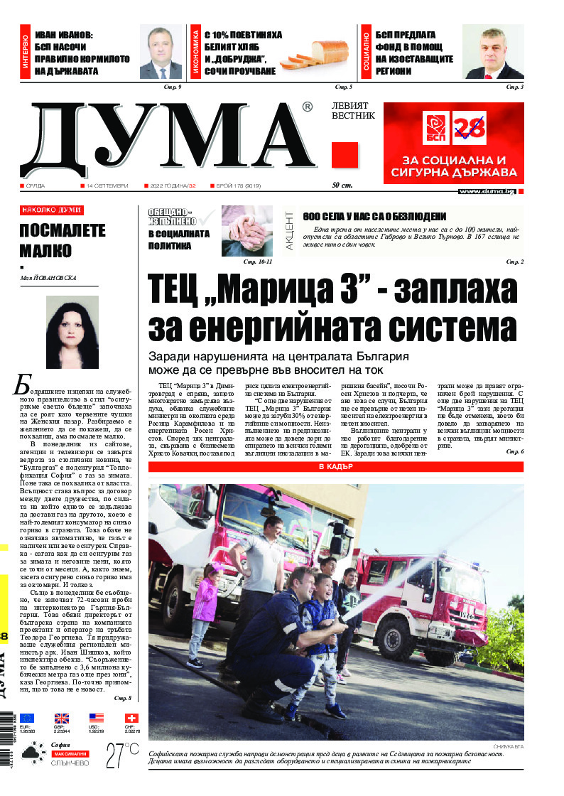 АБОНАМЕНТ за вестник „ДУМА“ за 2026 година. Можете да се абонирате в: „Български пощи“ АД до 15 декември 2025 г., „Доби прес“ ЕООД до 28 декември 2025 г., в редакцията на вестника до 20 декември 2025 г. Каталожен номер 6. Цени: 12 месеца - 149 € / 291,42 лв., 6 месеца - 75 € / 146,69 лв., 3 месеца - 40 € / 78,23 лв., 1 месец - 14 € / 27,38 лв. За повече информация тел. 02 9705 203 и 02 9705 216 отдел „Разпространение” на в-к ДУМА на ул. „Позитано” 20 А. E-mail: abonament@duma.bg АБОНАМЕНТ за вестник „ДУМА“ за 2026 година. Можете да се абонирате в: „Български пощи“ АД до 15 декември 2025 г., „Доби прес“ ЕООД до 28 декември 2025 г., в редакцията на вестника до 20 декември 2025 г. Каталожен номер 6. Цени: 12 месеца - 149 € / 291,42 лв., 6 месеца - 75 € / 146,69 лв., 3 месеца - 40 € / 78,23 лв., 1 месец - 14 € / 27,38 лв. За повече информация тел. 02 9705 203 и 02 9705 216 отдел „Разпространение” на в-к ДУМА на ул. „Позитано” 20 А. E-mail: abonament@duma.bg