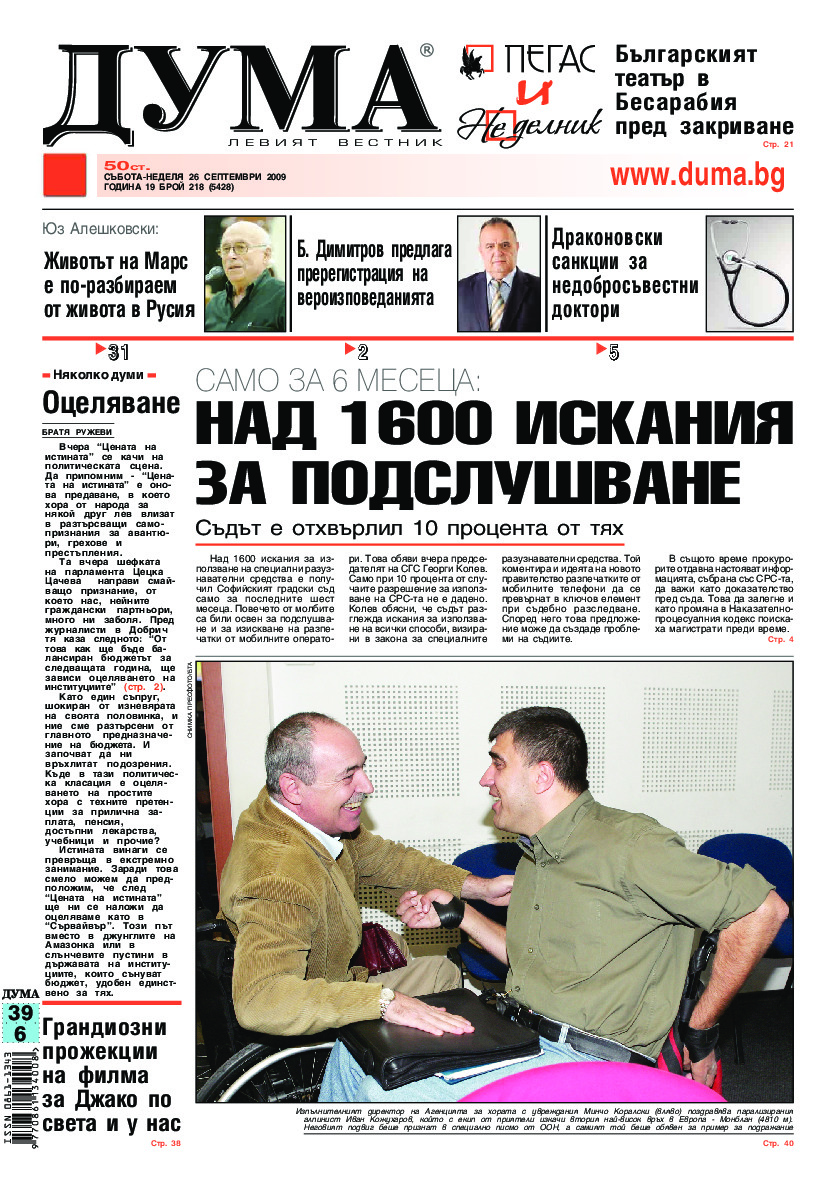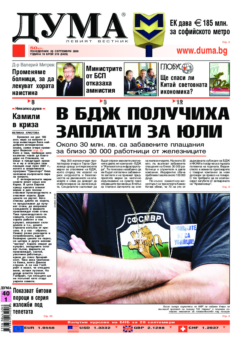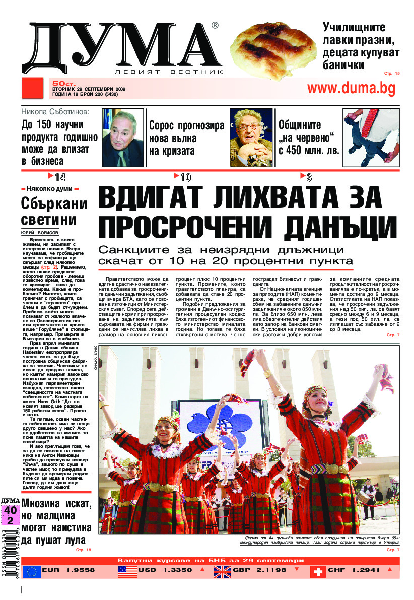 АБОНАМЕНТ за вестник „ДУМА“ за 2026 година. Можете да се абонирате в: „Български пощи“ АД до 15 декември 2025 г., „Доби прес“ ЕООД до 28 декември 2025 г., в редакцията на вестника до 20 декември 2025 г. Каталожен номер 6. Цени: 12 месеца - 149 € / 291,42 лв., 6 месеца - 75 € / 146,69 лв., 3 месеца - 40 € / 78,23 лв., 1 месец - 14 € / 27,38 лв. За повече информация тел. 02 9705 203 и 02 9705 216 отдел „Разпространение” на в-к ДУМА на ул. „Позитано” 20 А. E-mail: abonament@duma.bg АБОНАМЕНТ за вестник „ДУМА“ за 2026 година. Можете да се абонирате в: „Български пощи“ АД до 15 декември 2025 г., „Доби прес“ ЕООД до 28 декември 2025 г., в редакцията на вестника до 20 декември 2025 г. Каталожен номер 6. Цени: 12 месеца - 149 € / 291,42 лв., 6 месеца - 75 € / 146,69 лв., 3 месеца - 40 € / 78,23 лв., 1 месец - 14 € / 27,38 лв. За повече информация тел. 02 9705 203 и 02 9705 216 отдел „Разпространение” на в-к ДУМА на ул. „Позитано” 20 А. E-mail: abonament@duma.bg