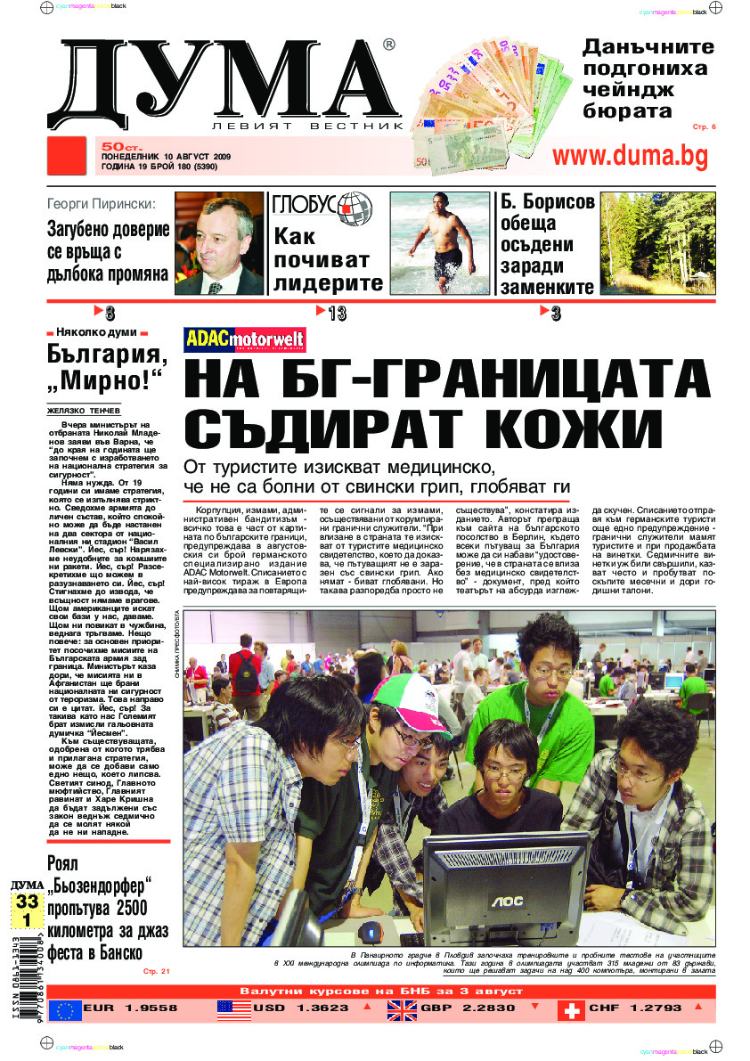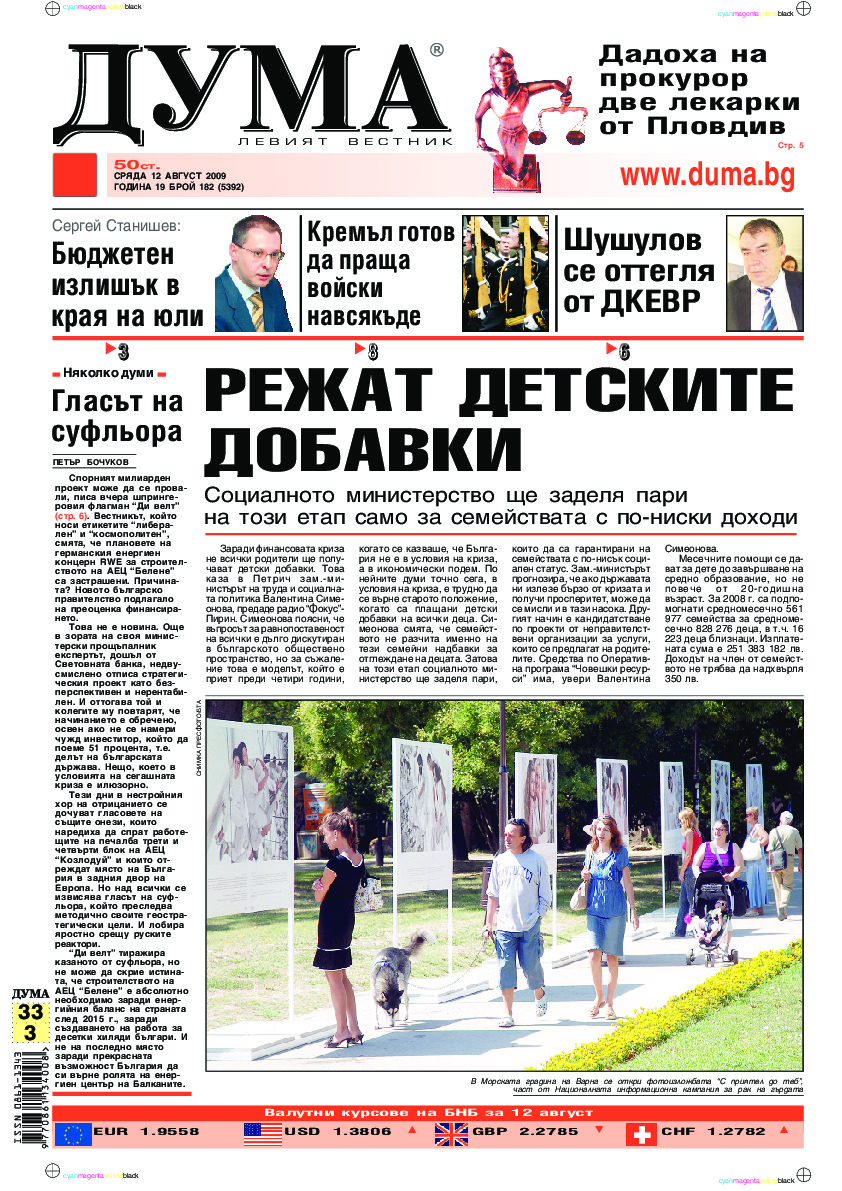 АБОНАМЕНТ за вестник „ДУМА“ за 2026 година. Можете да се абонирате в: „Български пощи“ АД до 15 декември 2025 г., „Доби прес“ ЕООД до 28 декември 2025 г., в редакцията на вестника до 20 декември 2025 г. Каталожен номер 6. Цени: 12 месеца - 149 € / 291,42 лв., 6 месеца - 75 € / 146,69 лв., 3 месеца - 40 € / 78,23 лв., 1 месец - 14 € / 27,38 лв. За повече информация тел. 02 9705 203 и 02 9705 216 отдел „Разпространение” на в-к ДУМА на ул. „Позитано” 20 А. E-mail: abonament@duma.bg АБОНАМЕНТ за вестник „ДУМА“ за 2026 година. Можете да се абонирате в: „Български пощи“ АД до 15 декември 2025 г., „Доби прес“ ЕООД до 28 декември 2025 г., в редакцията на вестника до 20 декември 2025 г. Каталожен номер 6. Цени: 12 месеца - 149 € / 291,42 лв., 6 месеца - 75 € / 146,69 лв., 3 месеца - 40 € / 78,23 лв., 1 месец - 14 € / 27,38 лв. За повече информация тел. 02 9705 203 и 02 9705 216 отдел „Разпространение” на в-к ДУМА на ул. „Позитано” 20 А. E-mail: abonament@duma.bg