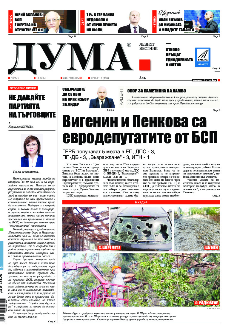 АБОНАМЕНТ за вестник „ДУМА“ за 2026 година. Можете да се абонирате в: „Български пощи“ АД до 15 декември 2025 г., „Доби прес“ ЕООД до 28 декември 2025 г., в редакцията на вестника до 20 декември 2025 г. Каталожен номер 6. Цени: 12 месеца - 149 € / 291,42 лв., 6 месеца - 75 € / 146,69 лв., 3 месеца - 40 € / 78,23 лв., 1 месец - 14 € / 27,38 лв. За повече информация тел. 02 9705 203 и 02 9705 216 отдел „Разпространение” на в-к ДУМА на ул. „Позитано” 20 А. E-mail: abonament@duma.bg АБОНАМЕНТ за вестник „ДУМА“ за 2026 година. Можете да се абонирате в: „Български пощи“ АД до 15 декември 2025 г., „Доби прес“ ЕООД до 28 декември 2025 г., в редакцията на вестника до 20 декември 2025 г. Каталожен номер 6. Цени: 12 месеца - 149 € / 291,42 лв., 6 месеца - 75 € / 146,69 лв., 3 месеца - 40 € / 78,23 лв., 1 месец - 14 € / 27,38 лв. За повече информация тел. 02 9705 203 и 02 9705 216 отдел „Разпространение” на в-к ДУМА на ул. „Позитано” 20 А. E-mail: abonament@duma.bg
