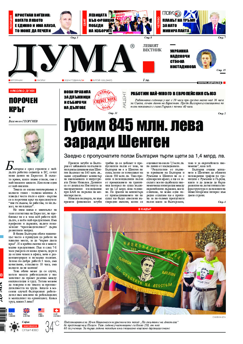 АБОНАМЕНТ за вестник „ДУМА“ за 2026 година. Можете да се абонирате в: „Български пощи“ АД до 15 декември 2025 г., „Доби прес“ ЕООД до 28 декември 2025 г., в редакцията на вестника до 20 декември 2025 г. Каталожен номер 6. Цени: 12 месеца - 149 € / 291,42 лв., 6 месеца - 75 € / 146,69 лв., 3 месеца - 40 € / 78,23 лв., 1 месец - 14 € / 27,38 лв. За повече информация тел. 02 9705 203 и 02 9705 216 отдел „Разпространение” на в-к ДУМА на ул. „Позитано” 20 А. E-mail: abonament@duma.bg АБОНАМЕНТ за вестник „ДУМА“ за 2026 година. Можете да се абонирате в: „Български пощи“ АД до 15 декември 2025 г., „Доби прес“ ЕООД до 28 декември 2025 г., в редакцията на вестника до 20 декември 2025 г. Каталожен номер 6. Цени: 12 месеца - 149 € / 291,42 лв., 6 месеца - 75 € / 146,69 лв., 3 месеца - 40 € / 78,23 лв., 1 месец - 14 € / 27,38 лв. За повече информация тел. 02 9705 203 и 02 9705 216 отдел „Разпространение” на в-к ДУМА на ул. „Позитано” 20 А. E-mail: abonament@duma.bg