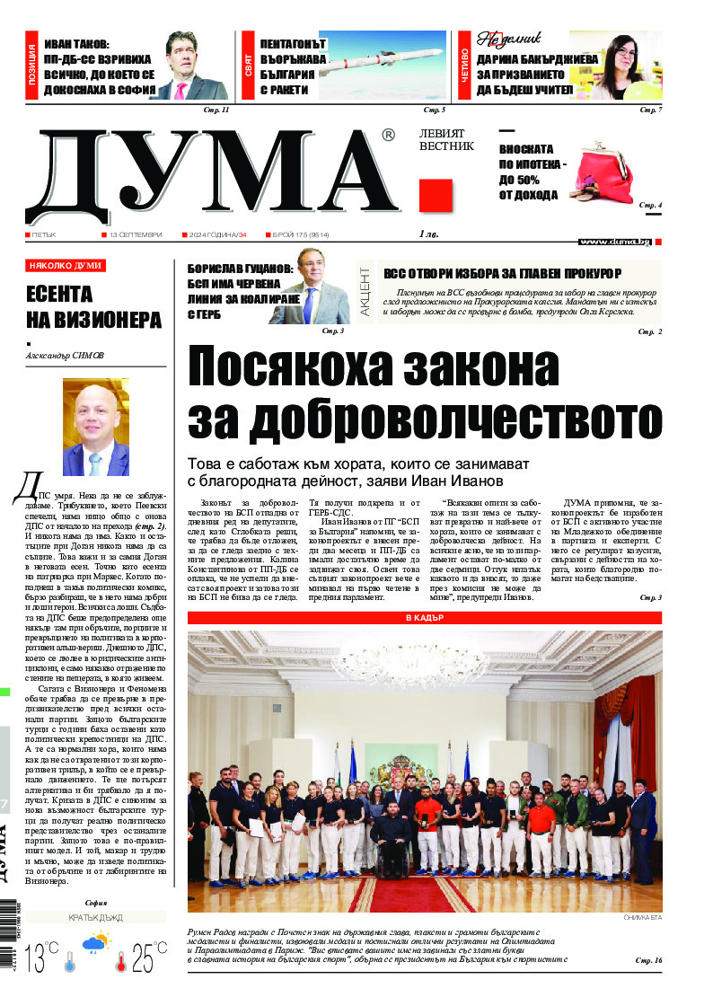 АБОНАМЕНТ за вестник „ДУМА“ за 2026 година. Можете да се абонирате в: „Български пощи“ АД до 15 декември 2025 г., „Доби прес“ ЕООД до 28 декември 2025 г., в редакцията на вестника до 20 декември 2025 г. Каталожен номер 6. Цени: 12 месеца - 149 € / 291,42 лв., 6 месеца - 75 € / 146,69 лв., 3 месеца - 40 € / 78,23 лв., 1 месец - 14 € / 27,38 лв. За повече информация тел. 02 9705 203 и 02 9705 216 отдел „Разпространение” на в-к ДУМА на ул. „Позитано” 20 А. E-mail: abonament@duma.bg АБОНАМЕНТ за вестник „ДУМА“ за 2026 година. Можете да се абонирате в: „Български пощи“ АД до 15 декември 2025 г., „Доби прес“ ЕООД до 28 декември 2025 г., в редакцията на вестника до 20 декември 2025 г. Каталожен номер 6. Цени: 12 месеца - 149 € / 291,42 лв., 6 месеца - 75 € / 146,69 лв., 3 месеца - 40 € / 78,23 лв., 1 месец - 14 € / 27,38 лв. За повече информация тел. 02 9705 203 и 02 9705 216 отдел „Разпространение” на в-к ДУМА на ул. „Позитано” 20 А. E-mail: abonament@duma.bg