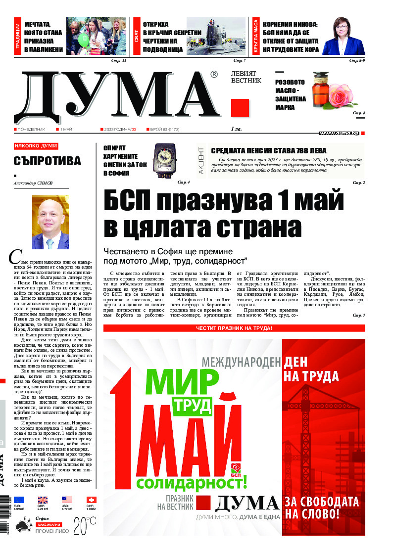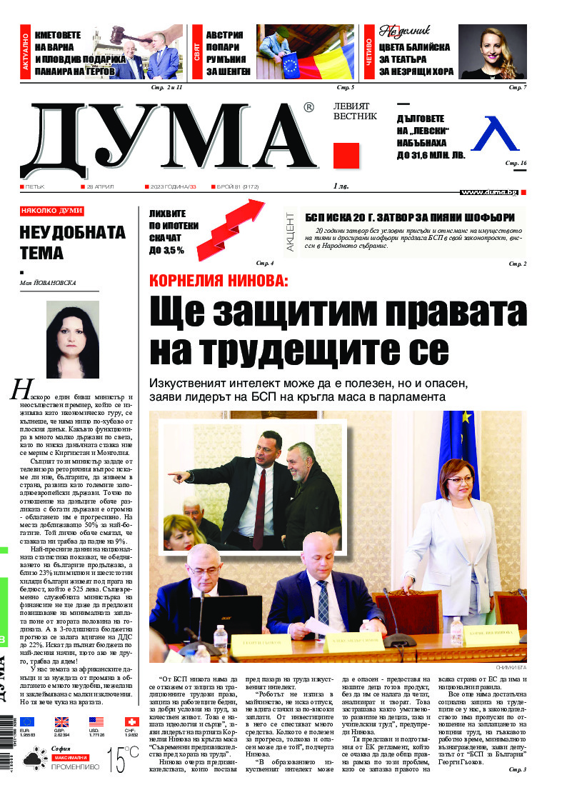АБОНАМЕНТ за вестник „ДУМА“ за 2026 година. Можете да се абонирате в: „Български пощи“ АД до 15 декември 2025 г., „Доби прес“ ЕООД до 28 декември 2025 г., в редакцията на вестника до 20 декември 2025 г. Каталожен номер 6. Цени: 12 месеца - 149 € / 291,42 лв., 6 месеца - 75 € / 146,69 лв., 3 месеца - 40 € / 78,23 лв., 1 месец - 14 € / 27,38 лв. За повече информация тел. 02 9705 203 и 02 9705 216 отдел „Разпространение” на в-к ДУМА на ул. „Позитано” 20 А. E-mail: abonament@duma.bg АБОНАМЕНТ за вестник „ДУМА“ за 2026 година. Можете да се абонирате в: „Български пощи“ АД до 15 декември 2025 г., „Доби прес“ ЕООД до 28 декември 2025 г., в редакцията на вестника до 20 декември 2025 г. Каталожен номер 6. Цени: 12 месеца - 149 € / 291,42 лв., 6 месеца - 75 € / 146,69 лв., 3 месеца - 40 € / 78,23 лв., 1 месец - 14 € / 27,38 лв. За повече информация тел. 02 9705 203 и 02 9705 216 отдел „Разпространение” на в-к ДУМА на ул. „Позитано” 20 А. E-mail: abonament@duma.bg