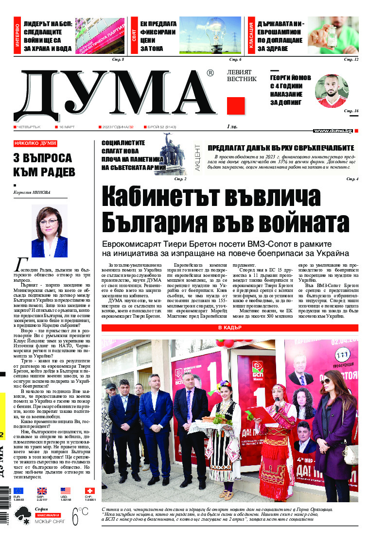 АБОНАМЕНТ за вестник „ДУМА“ за 2026 година. Можете да се абонирате в: „Български пощи“ АД до 15 декември 2025 г., „Доби прес“ ЕООД до 28 декември 2025 г., в редакцията на вестника до 20 декември 2025 г. Каталожен номер 6. Цени: 12 месеца - 149 € / 291,42 лв., 6 месеца - 75 € / 146,69 лв., 3 месеца - 40 € / 78,23 лв., 1 месец - 14 € / 27,38 лв. За повече информация тел. 02 9705 203 и 02 9705 216 отдел „Разпространение” на в-к ДУМА на ул. „Позитано” 20 А. E-mail: abonament@duma.bg АБОНАМЕНТ за вестник „ДУМА“ за 2026 година. Можете да се абонирате в: „Български пощи“ АД до 15 декември 2025 г., „Доби прес“ ЕООД до 28 декември 2025 г., в редакцията на вестника до 20 декември 2025 г. Каталожен номер 6. Цени: 12 месеца - 149 € / 291,42 лв., 6 месеца - 75 € / 146,69 лв., 3 месеца - 40 € / 78,23 лв., 1 месец - 14 € / 27,38 лв. За повече информация тел. 02 9705 203 и 02 9705 216 отдел „Разпространение” на в-к ДУМА на ул. „Позитано” 20 А. E-mail: abonament@duma.bg
