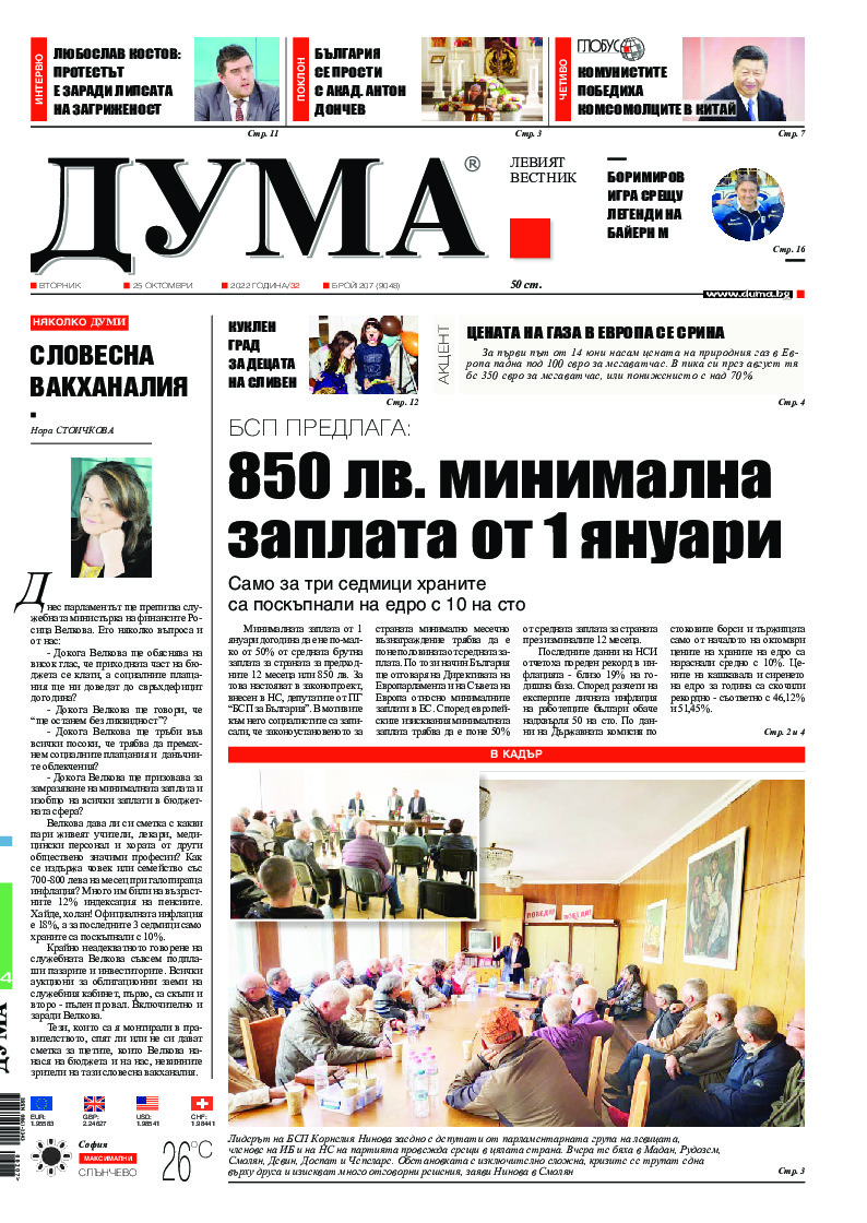АБОНАМЕНТ за вестник „ДУМА“ за 2026 година. Можете да се абонирате в: „Български пощи“ АД до 15 декември 2025 г., „Доби прес“ ЕООД до 28 декември 2025 г., в редакцията на вестника до 20 декември 2025 г. Каталожен номер 6. Цени: 12 месеца - 149 € / 291,42 лв., 6 месеца - 75 € / 146,69 лв., 3 месеца - 40 € / 78,23 лв., 1 месец - 14 € / 27,38 лв. За повече информация тел. 02 9705 203 и 02 9705 216 отдел „Разпространение” на в-к ДУМА на ул. „Позитано” 20 А. E-mail: abonament@duma.bg АБОНАМЕНТ за вестник „ДУМА“ за 2026 година. Можете да се абонирате в: „Български пощи“ АД до 15 декември 2025 г., „Доби прес“ ЕООД до 28 декември 2025 г., в редакцията на вестника до 20 декември 2025 г. Каталожен номер 6. Цени: 12 месеца - 149 € / 291,42 лв., 6 месеца - 75 € / 146,69 лв., 3 месеца - 40 € / 78,23 лв., 1 месец - 14 € / 27,38 лв. За повече информация тел. 02 9705 203 и 02 9705 216 отдел „Разпространение” на в-к ДУМА на ул. „Позитано” 20 А. E-mail: abonament@duma.bg