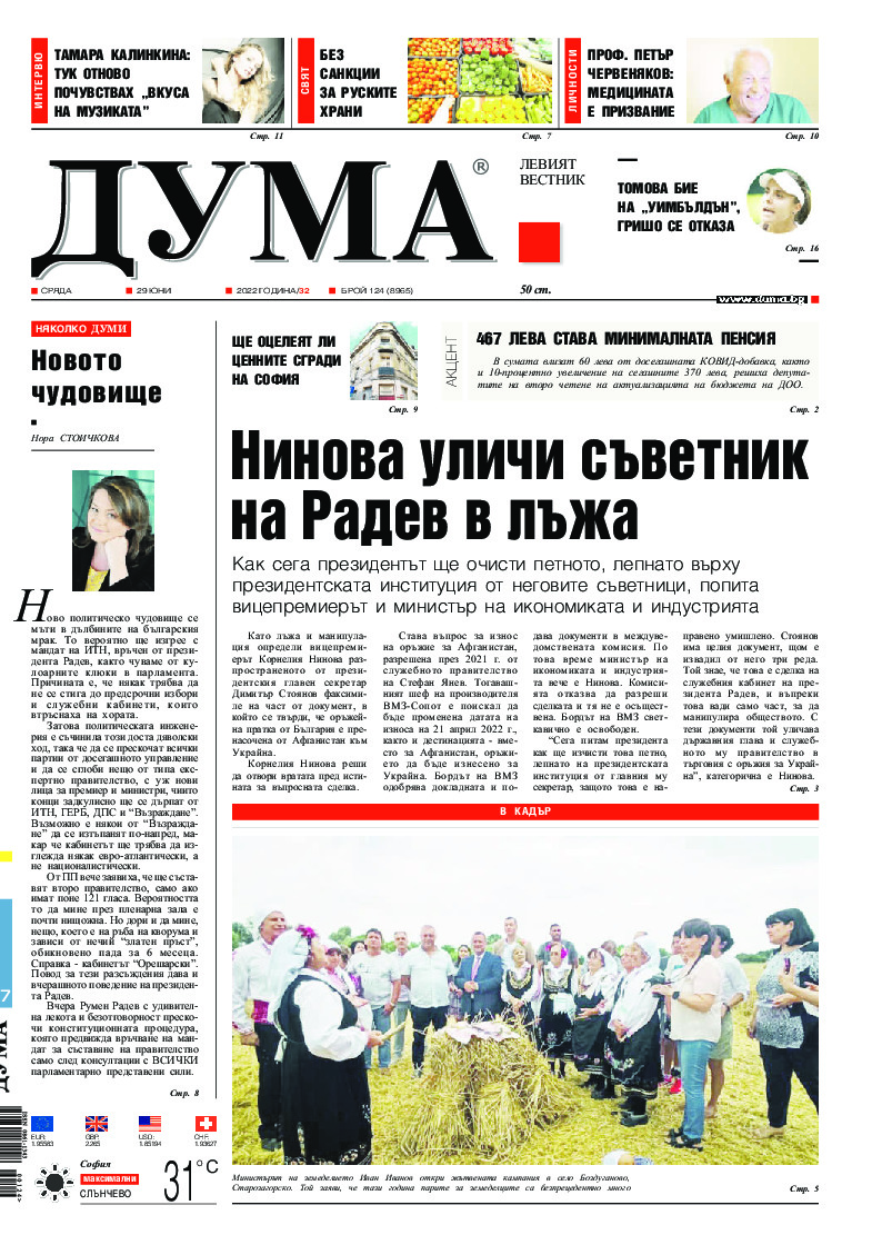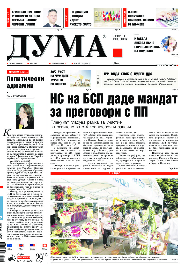 АБОНАМЕНТ за вестник „ДУМА“ за 2026 година. Можете да се абонирате в: „Български пощи“ АД до 15 декември 2025 г., „Доби прес“ ЕООД до 28 декември 2025 г., в редакцията на вестника до 20 декември 2025 г. Каталожен номер 6. Цени: 12 месеца - 149 € / 291,42 лв., 6 месеца - 75 € / 146,69 лв., 3 месеца - 40 € / 78,23 лв., 1 месец - 14 € / 27,38 лв. За повече информация тел. 02 9705 203 и 02 9705 216 отдел „Разпространение” на в-к ДУМА на ул. „Позитано” 20 А. E-mail: abonament@duma.bg АБОНАМЕНТ за вестник „ДУМА“ за 2026 година. Можете да се абонирате в: „Български пощи“ АД до 15 декември 2025 г., „Доби прес“ ЕООД до 28 декември 2025 г., в редакцията на вестника до 20 декември 2025 г. Каталожен номер 6. Цени: 12 месеца - 149 € / 291,42 лв., 6 месеца - 75 € / 146,69 лв., 3 месеца - 40 € / 78,23 лв., 1 месец - 14 € / 27,38 лв. За повече информация тел. 02 9705 203 и 02 9705 216 отдел „Разпространение” на в-к ДУМА на ул. „Позитано” 20 А. E-mail: abonament@duma.bg