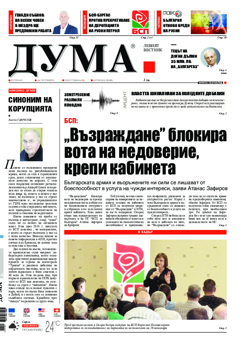 АБОНАМЕНТ за вестник „ДУМА“ за 2026 година. Можете да се абонирате в: „Български пощи“ АД до 15 декември 2025 г., „Доби прес“ ЕООД до 28 декември 2025 г., в редакцията на вестника до 20 декември 2025 г. Каталожен номер 6. Цени: 12 месеца - 149 € / 291,42 лв., 6 месеца - 75 € / 146,69 лв., 3 месеца - 40 € / 78,23 лв., 1 месец - 14 € / 27,38 лв. За повече информация тел. 02 9705 203 и 02 9705 216 отдел „Разпространение” на в-к ДУМА на ул. „Позитано” 20 А. E-mail: abonament@duma.bg АБОНАМЕНТ за вестник „ДУМА“ за 2026 година. Можете да се абонирате в: „Български пощи“ АД до 15 декември 2025 г., „Доби прес“ ЕООД до 28 декември 2025 г., в редакцията на вестника до 20 декември 2025 г. Каталожен номер 6. Цени: 12 месеца - 149 € / 291,42 лв., 6 месеца - 75 € / 146,69 лв., 3 месеца - 40 € / 78,23 лв., 1 месец - 14 € / 27,38 лв. За повече информация тел. 02 9705 203 и 02 9705 216 отдел „Разпространение” на в-к ДУМА на ул. „Позитано” 20 А. E-mail: abonament@duma.bg