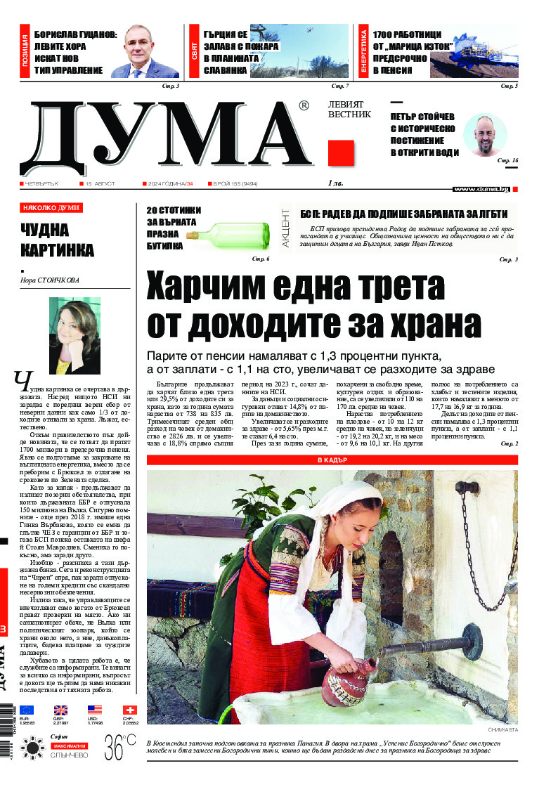 АБОНАМЕНТ за вестник „ДУМА“ за 2026 година. Можете да се абонирате в: „Български пощи“ АД до 15 декември 2025 г., „Доби прес“ ЕООД до 28 декември 2025 г., в редакцията на вестника до 20 декември 2025 г. Каталожен номер 6. Цени: 12 месеца - 149 € / 291,42 лв., 6 месеца - 75 € / 146,69 лв., 3 месеца - 40 € / 78,23 лв., 1 месец - 14 € / 27,38 лв. За повече информация тел. 02 9705 203 и 02 9705 216 отдел „Разпространение” на в-к ДУМА на ул. „Позитано” 20 А. E-mail: abonament@duma.bg АБОНАМЕНТ за вестник „ДУМА“ за 2026 година. Можете да се абонирате в: „Български пощи“ АД до 15 декември 2025 г., „Доби прес“ ЕООД до 28 декември 2025 г., в редакцията на вестника до 20 декември 2025 г. Каталожен номер 6. Цени: 12 месеца - 149 € / 291,42 лв., 6 месеца - 75 € / 146,69 лв., 3 месеца - 40 € / 78,23 лв., 1 месец - 14 € / 27,38 лв. За повече информация тел. 02 9705 203 и 02 9705 216 отдел „Разпространение” на в-к ДУМА на ул. „Позитано” 20 А. E-mail: abonament@duma.bg