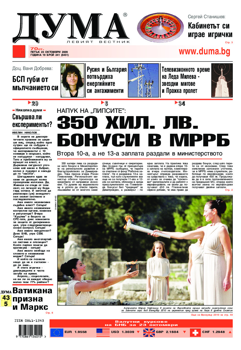 АБОНАМЕНТ за вестник „ДУМА“ за 2026 година. Можете да се абонирате в: „Български пощи“ АД до 15 декември 2025 г., „Доби прес“ ЕООД до 28 декември 2025 г., в редакцията на вестника до 20 декември 2025 г. Каталожен номер 6. Цени: 12 месеца - 149 € / 291,42 лв., 6 месеца - 75 € / 146,69 лв., 3 месеца - 40 € / 78,23 лв., 1 месец - 14 € / 27,38 лв. За повече информация тел. 02 9705 203 и 02 9705 216 отдел „Разпространение” на в-к ДУМА на ул. „Позитано” 20 А. E-mail: abonament@duma.bg АБОНАМЕНТ за вестник „ДУМА“ за 2026 година. Можете да се абонирате в: „Български пощи“ АД до 15 декември 2025 г., „Доби прес“ ЕООД до 28 декември 2025 г., в редакцията на вестника до 20 декември 2025 г. Каталожен номер 6. Цени: 12 месеца - 149 € / 291,42 лв., 6 месеца - 75 € / 146,69 лв., 3 месеца - 40 € / 78,23 лв., 1 месец - 14 € / 27,38 лв. За повече информация тел. 02 9705 203 и 02 9705 216 отдел „Разпространение” на в-к ДУМА на ул. „Позитано” 20 А. E-mail: abonament@duma.bg