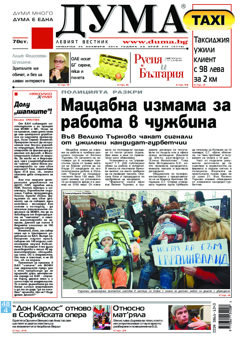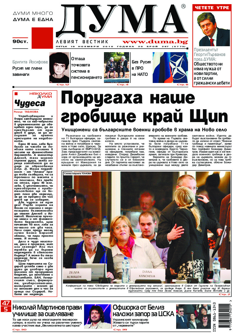 АБОНАМЕНТ за вестник „ДУМА“ за 2026 година. Можете да се абонирате в: „Български пощи“ АД до 15 декември 2025 г., „Доби прес“ ЕООД до 28 декември 2025 г., в редакцията на вестника до 20 декември 2025 г. Каталожен номер 6. Цени: 12 месеца - 149 € / 291,42 лв., 6 месеца - 75 € / 146,69 лв., 3 месеца - 40 € / 78,23 лв., 1 месец - 14 € / 27,38 лв. За повече информация тел. 02 9705 203 и 02 9705 216 отдел „Разпространение” на в-к ДУМА на ул. „Позитано” 20 А. E-mail: abonament@duma.bg АБОНАМЕНТ за вестник „ДУМА“ за 2026 година. Можете да се абонирате в: „Български пощи“ АД до 15 декември 2025 г., „Доби прес“ ЕООД до 28 декември 2025 г., в редакцията на вестника до 20 декември 2025 г. Каталожен номер 6. Цени: 12 месеца - 149 € / 291,42 лв., 6 месеца - 75 € / 146,69 лв., 3 месеца - 40 € / 78,23 лв., 1 месец - 14 € / 27,38 лв. За повече информация тел. 02 9705 203 и 02 9705 216 отдел „Разпространение” на в-к ДУМА на ул. „Позитано” 20 А. E-mail: abonament@duma.bg